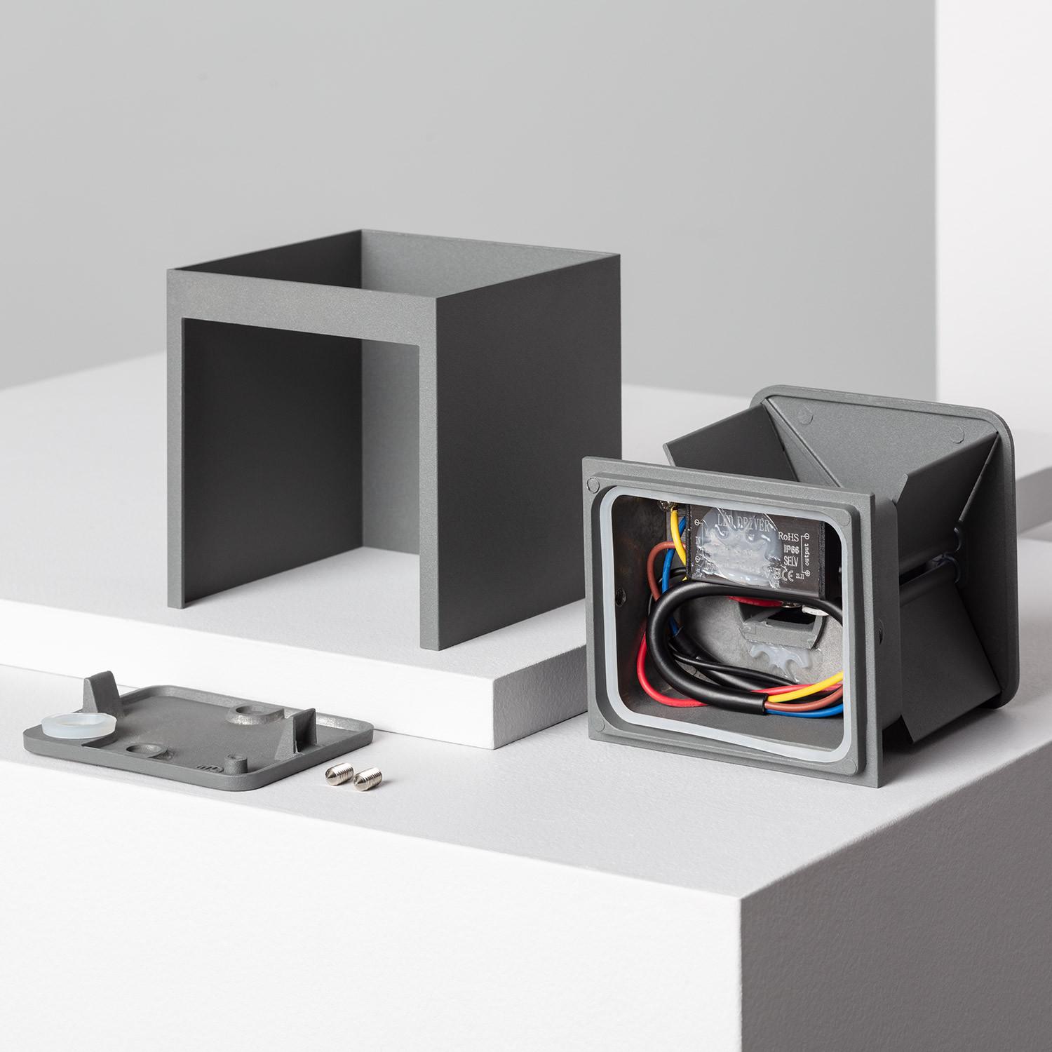 Avec ses dimensions compactes de 100 x 100 x 100 mm et sa finition grise en aluminium, cette applique extérieure trouve facilement sa place sur des architectures contemporaines comme sur des ambiances plus classiques. Son format net habille le mur avec discrétion et précision.