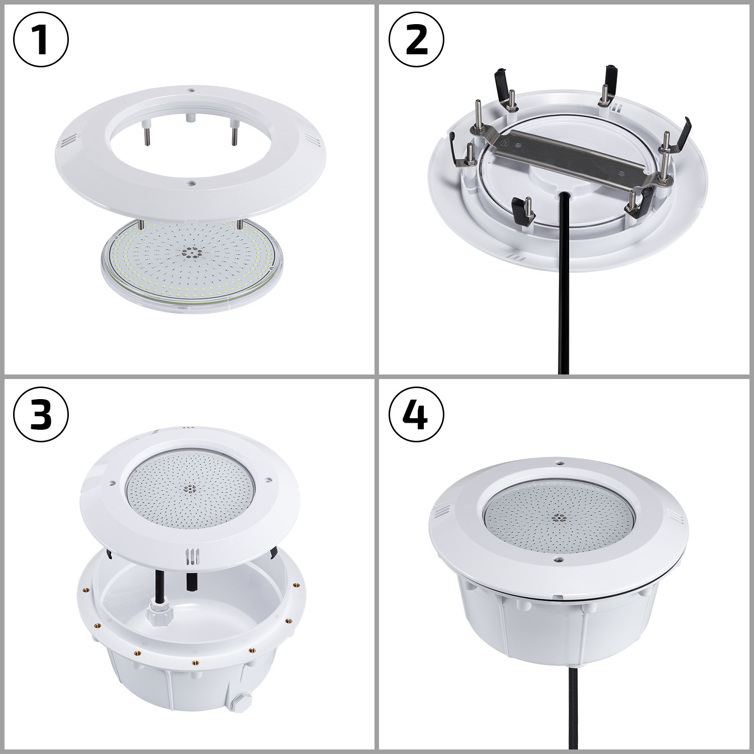 Coupez toujours l'alimentation avant l'installation. Cette ampoule slim PAR56 est conçue pour une installation en niche. Insérez l'ampoule dans le logement puis fixez la rosace de maintien comme indiqué sur les images. Raccordez le câble aux bornes du contrôleur/alimentation 12V DC en respectant la polarité et les codes de couleurs, et placez le transformateur hors de l'eau dans un boîtier ventilé et protégé. Veillez à vérifier l'étanchéité du joint pour garantir l'indice IP68 en service.
