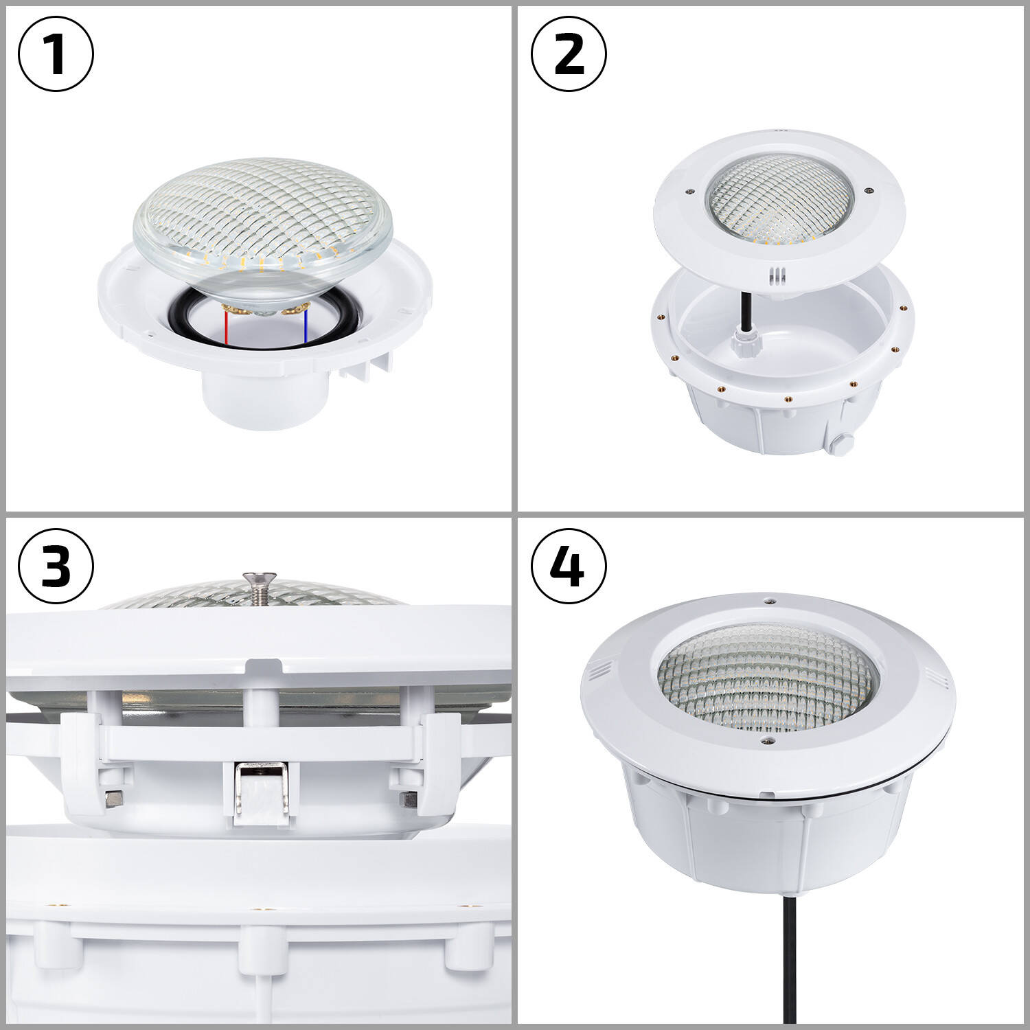 L'installation se fait en niche comme montré sur les images. Retirez la platine de la niche, insérez l'ampoule PAR56 dans l'emplacement, fixez-la avec les clips de maintien visibles et reconnectez le câble en respectant l'étanchéité. Vérifiez la profondeur et les joints avant de remettre l'eau et confiez l'opération à un professionnel si nécessaire.