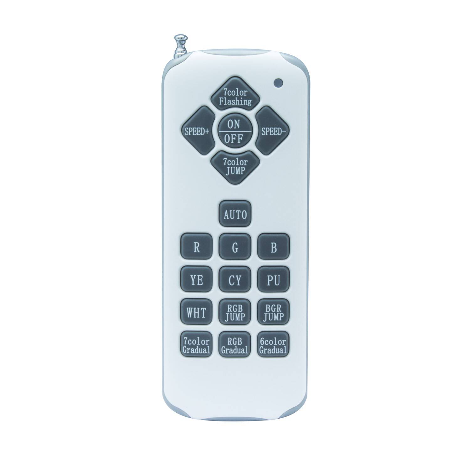 La télécommande RF incluse permet de sélectionner les couleurs RGB, d'activer des modes prédéfinis, de régler la vitesse des effets et d'allumer ou d'éteindre l'ampoule. Branchez l'ampoule, utilisez les touches de couleur ou de scène pour parcourir les effets et consultez la notice fournie pour les instructions de synchronisation si nécessaire.