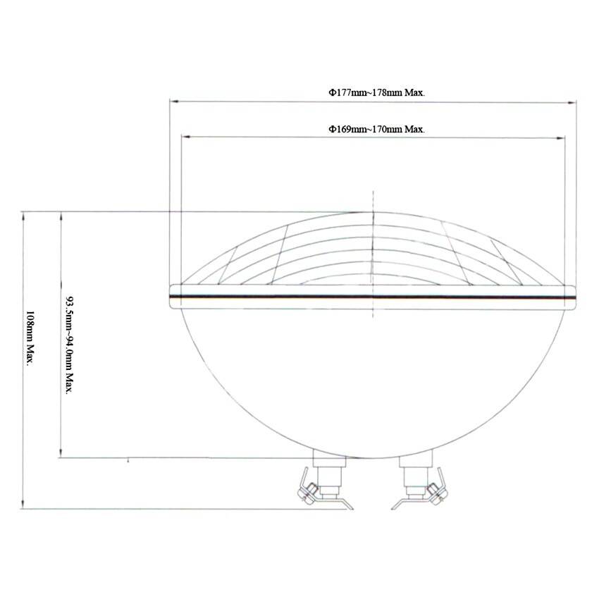 L'ampoule a un diamètre de 178 mm et une hauteur de 108 mm et est prévue pour une installation en niche compatible PAR56. Elle se connecte sur une alimentation 12V AC et utilise des clips de fixation visibles sur les photos. Coupez toujours l'alimentation avant pose et faites réaliser le raccordement au transformateur 12V AC par un électricien qualifié.