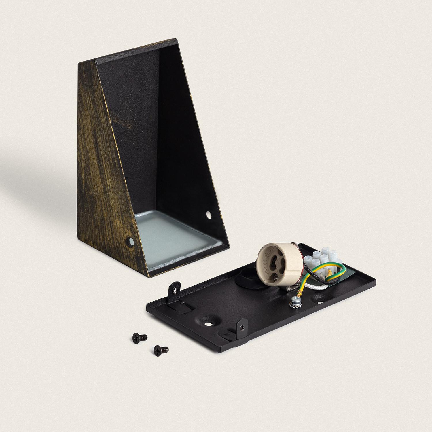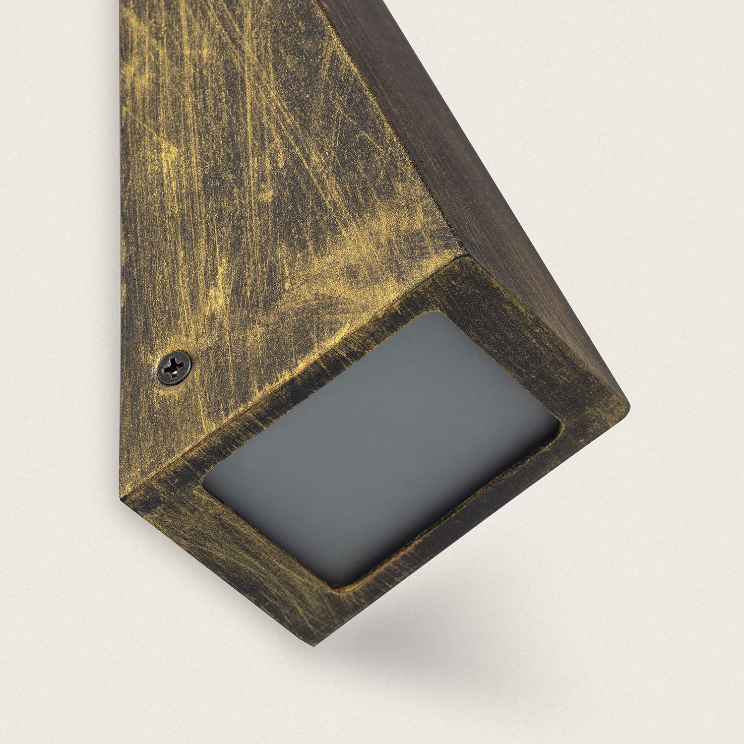 La finition noir‑doré patinée confère une allure artisanale, mêlant sobriété noire et reflets dorés usés. Cette patine sublime les lignes géométriques du luminaire et s’harmonise aux architectures rustiques, industrielles ou méditerranéennes, apportant à la fois caractère et discrétion raffinée, et une présence élégante sur chaque façade.
