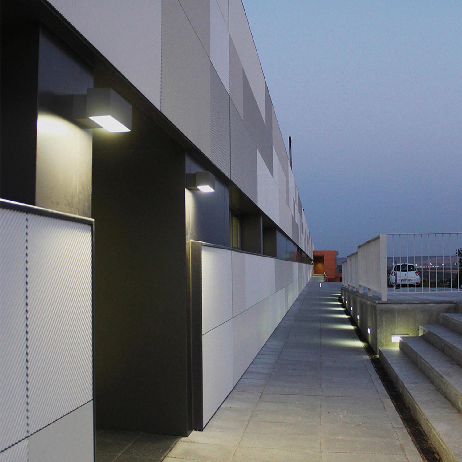 La double face crée un éclairage directionnel vers le haut et vers le bas, assurant orientation et mise en valeur architecturale. Avec deux points lumineux en blanc chaud 3000K, elle produit un rendu confortable et homogène, idéal pour circulations extérieures et zones d’accueil.