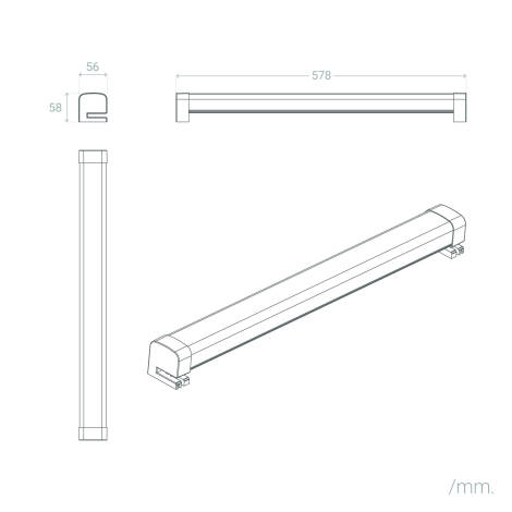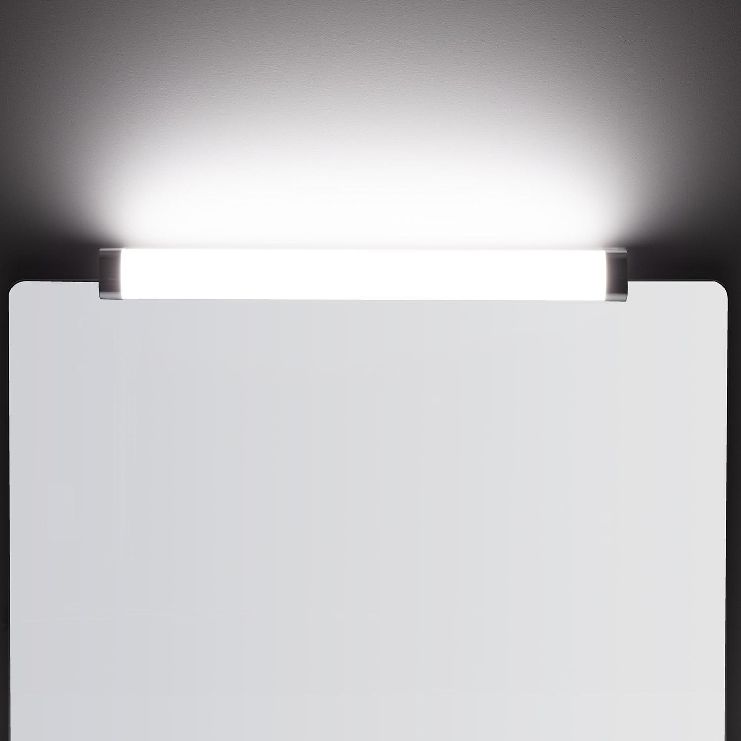 Son profil élégant de 578 mm de long et 56 mm de large se pose avec discrétion au-dessus du miroir. La teinte argentée et le corps en PC à diffuseur opale créent une silhouette raffinée, parfaitement adaptée aux salles de bains contemporaines et aux façades extérieures protégées.