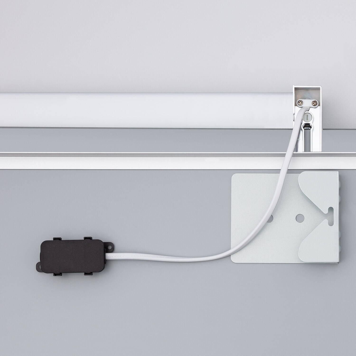 L'applique se monte en surface au dessus d'un miroir grâce à sa platine et ses fixations visibles sur les images. Le corps se clipse sur l'embase pour maintenir la lampe en place. L'installation électrique se fait en 220-240V AC par raccordement au circuit existant. Pour une mise en œuvre sûre et conforme, nous recommandons de confier la pose à un électricien qualifié.
