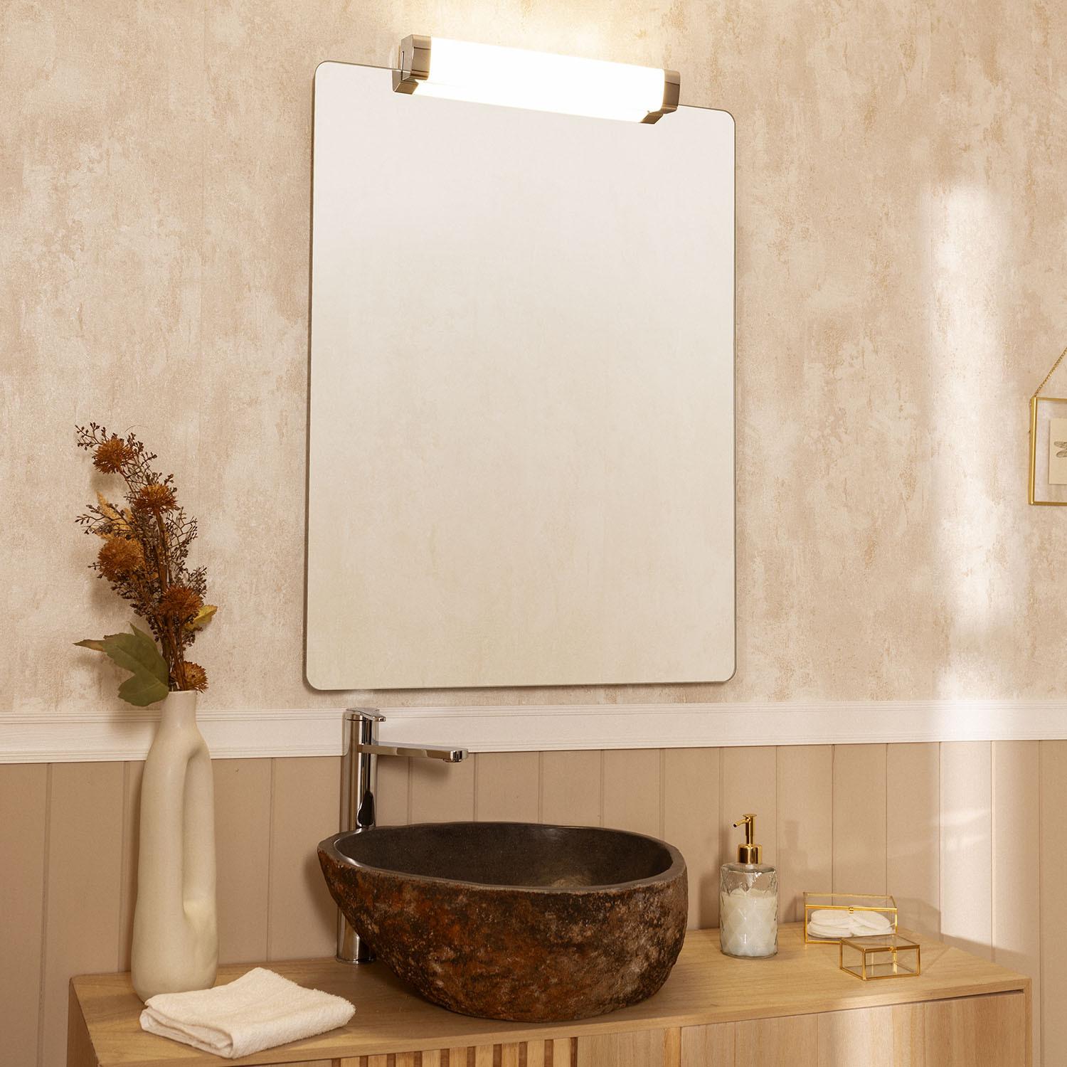 L applique diffuse un blanc neutre 4000K et 900 lumens, soit un rendu lumineux naturel adapté au maquillage et au rasage. Avec un rendement de 100 lm/W et une durée de vie annoncée de 40 000 heures cette lampe offre une lumière stable et sans scintillement.
