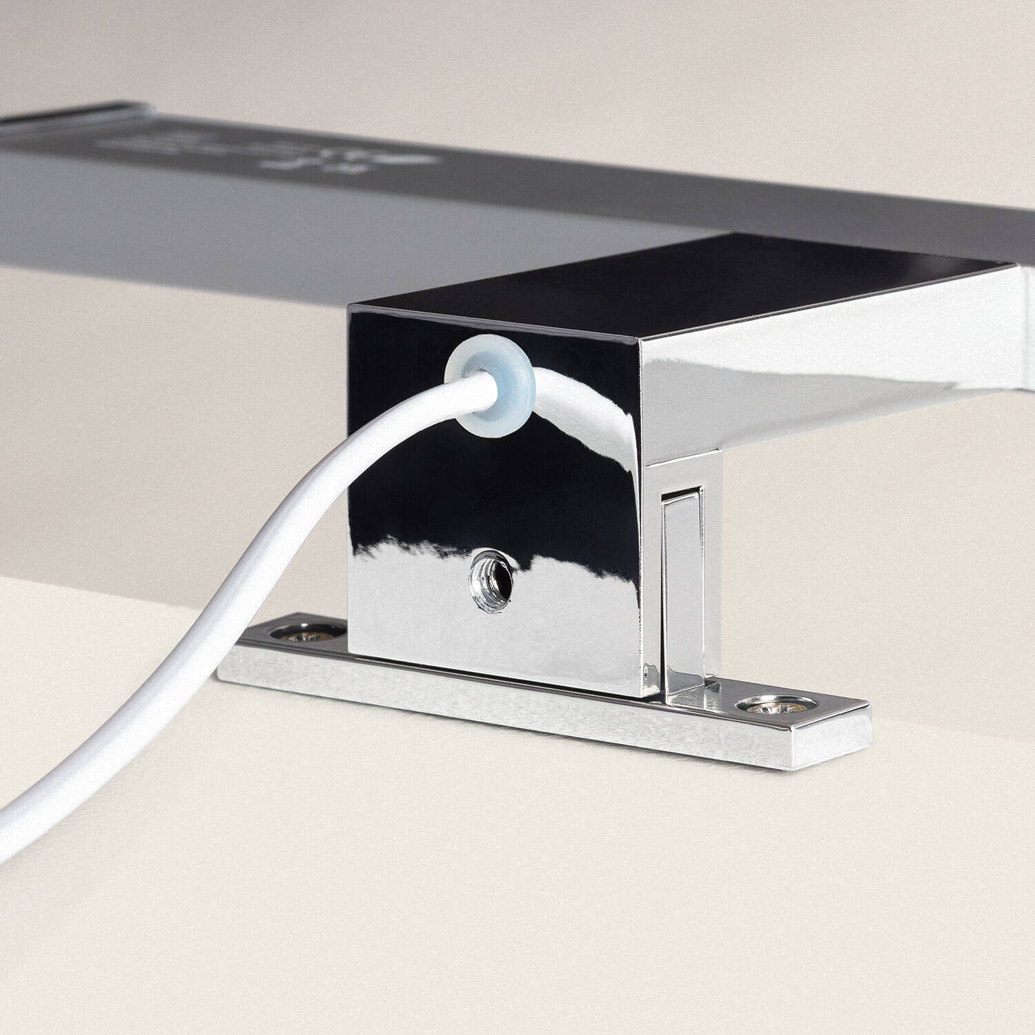 La fixation fournie permet de positionner l'applique au dessus du miroir comme sur les photos. Le câble de connexion mesure 300 mm et l'appareil se raccorde au réseau 220-240V AC. La classe d'isolation II évite la broche de terre mais nous recommandons le raccordement par un électricien qualifié pour un montage sûr et conforme.