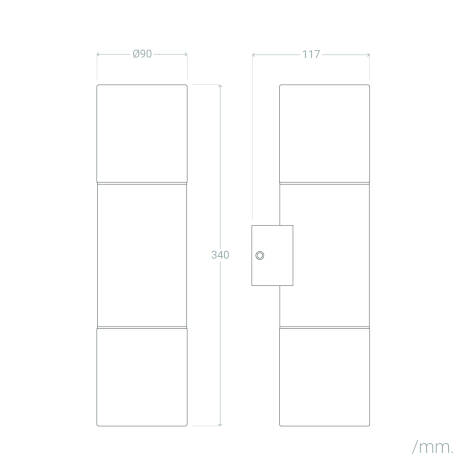Le noir profond et les abat-jour en verre fumé définissent un rendu élégant qui sublime façades et entrées. Sa silhouette verticale compacte (340 mm de hauteur, 117 mm de longueur, 90 mm de largeur) offre un impact visuel équilibré sans surcharger l’architecture extérieure.