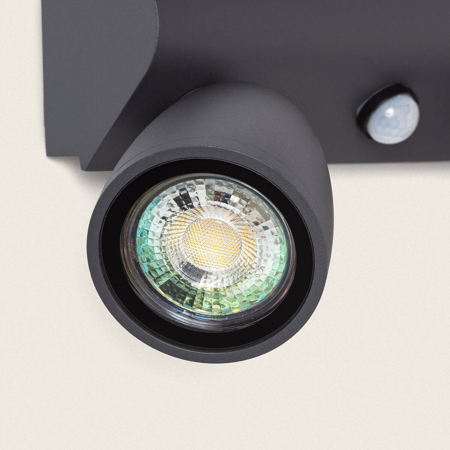 Cette applique murale extérieure en aluminium gris foncé associe deux spots orientables et un détecteur de mouvement pour un éclairage ciblé, pratique et sécurisant autour de la maison. Idéale en façade, terrasse ou entrée, elle résiste aux intempéries grâce à son indice IP65. Ampoules GU10 non incluses.