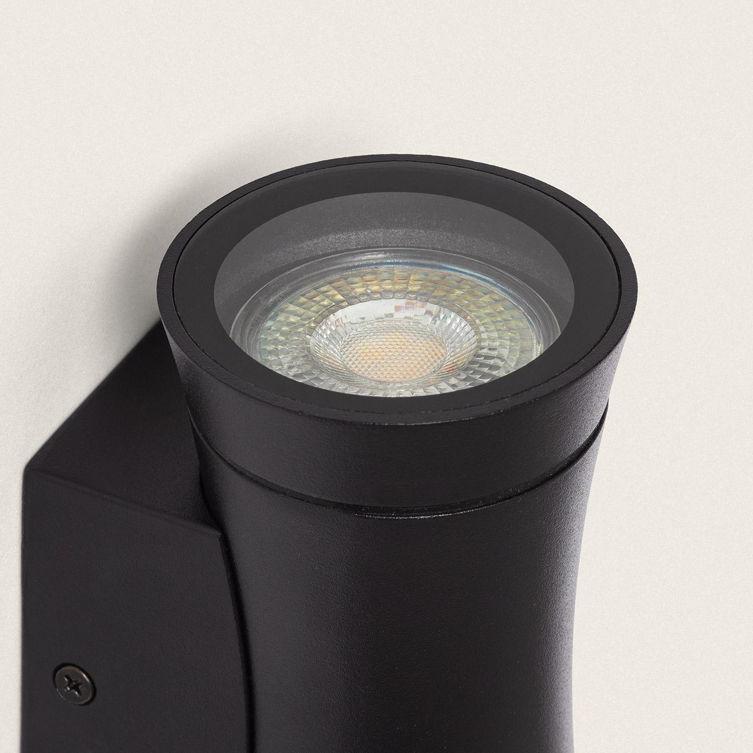 Les deux points lumineux offrent un éclairage directionnel précis, idéal pour mettre en valeur entrées et reliefs de façade. Compatible avec des ampoules GU10, la puissance est limitée à 10 W par source, et les ampoules nécessaires ne sont pas fournies, laissant le choix du rendu lumineux.