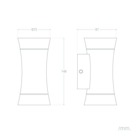 Dimensions visibles sur les visuels et la fiche technique environ hauteur 146 mm, largeur 72 mm et profondeur 87 mm. Son design compact et profilé permet un rendu up and down décoratif sans trop empiéter sur la façade.