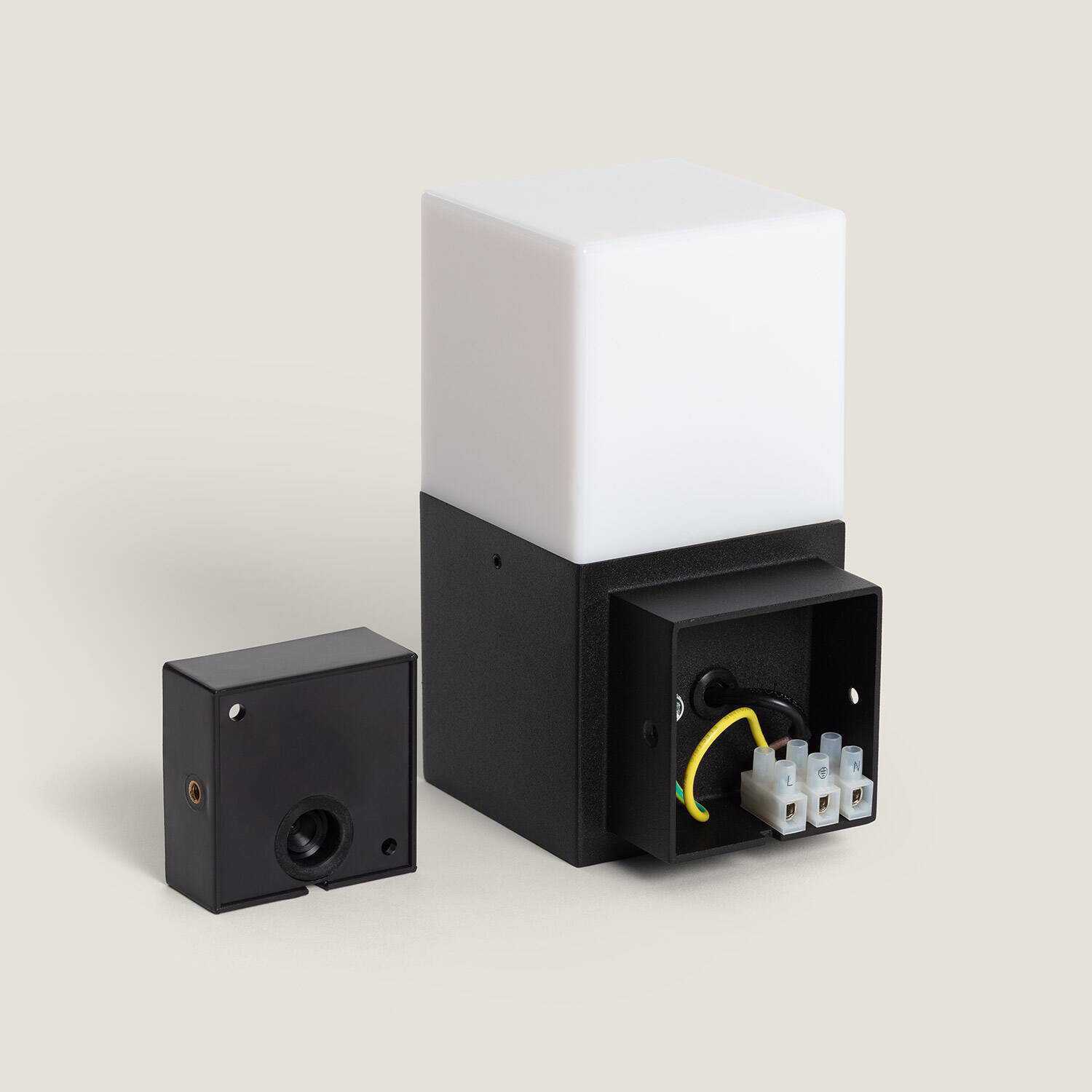 Le format rectangulaire et les proportions réduites (environ 110×160×80 mm) permettent une intégration discrète sur murs et colonnes. L’alliance de l’aluminium noir et du PMMA opale crée un contraste contemporain qui met en valeur l’architecture sans surcharger l’espace visuel extérieur.