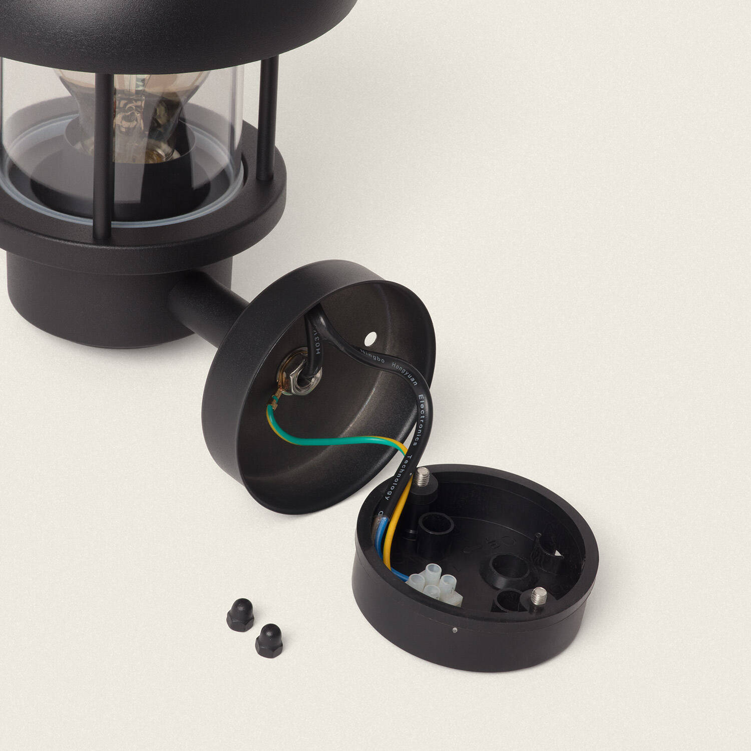 L'applique est prévue pour une installation en surface sur boîte de dérivation. Les photos montrent un compartiment de câblage accessible pour raccorder la phase, le neutre et la terre. Coupez toujours l'alimentation avant d'intervenir et faites appel à un électricien qualifié pour le raccordement en 220-240V afin d'assurer une installation sûre.