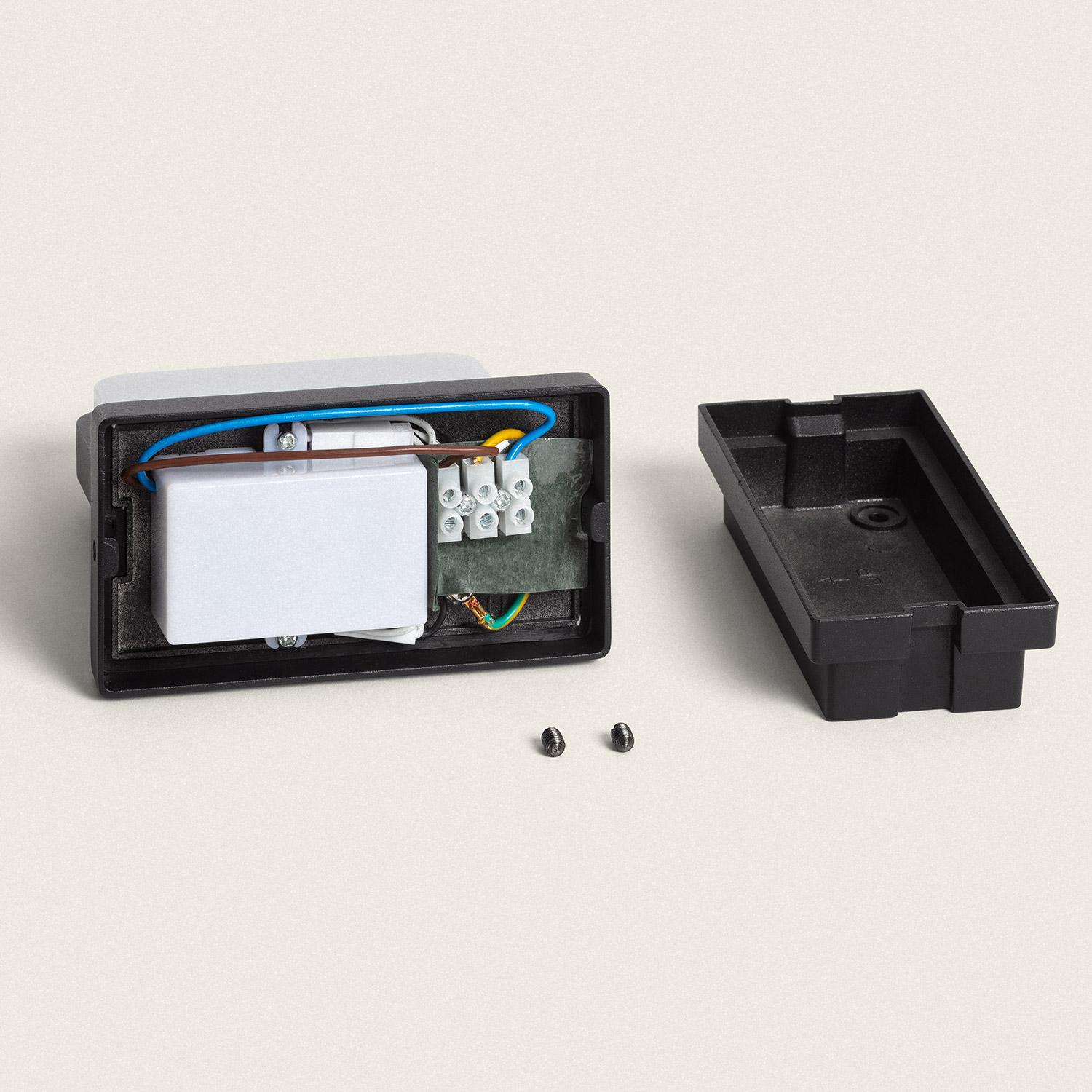 L'applique se fixe en installation murale en saillie sur une alimentation 220-240 V AC 50-60 Hz. Le produit est de classe I, il nécessite donc une liaison à la terre. La boîte de connexion est accessible sous le capot visible sur les photos. Nous recommandons une installation par un électricien qualifié et l'utilisation de chevilles adaptées au support. Dimensions utiles 120 mm x 120 mm x 63 mm.