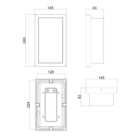 L'applique se fixe en surface sur un mur et fonctionne en 220-240V AC 50-60 Hz. C'est un produit de classe d'isolation I ce qui nécessite une connexion à la terre. Respectez les dimensions utiles 240 mm de hauteur 145 mm de largeur et 83 mm de profondeur lors du positionnement. Pour une installation conforme et sécurisée faites appel à un électricien qualifié.
