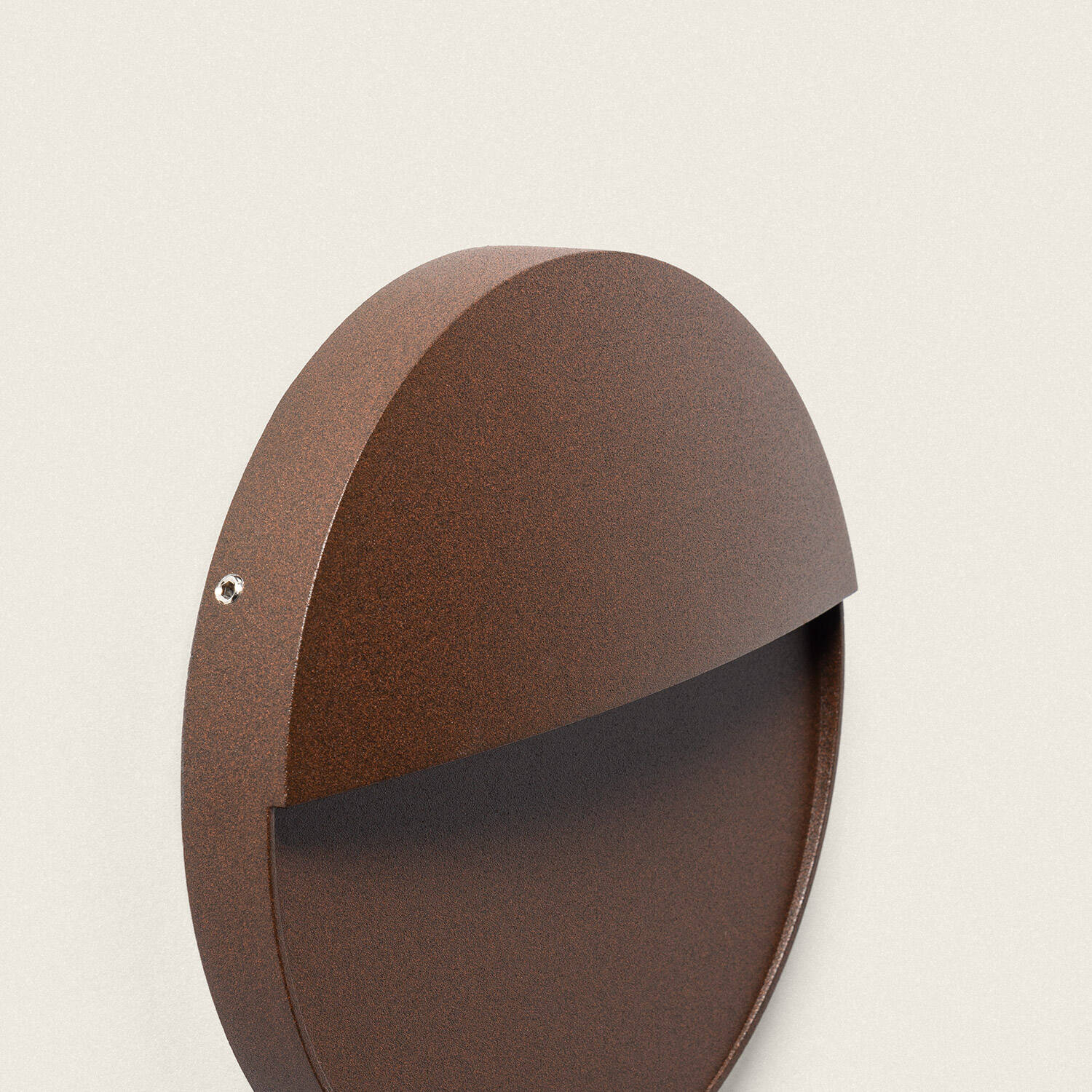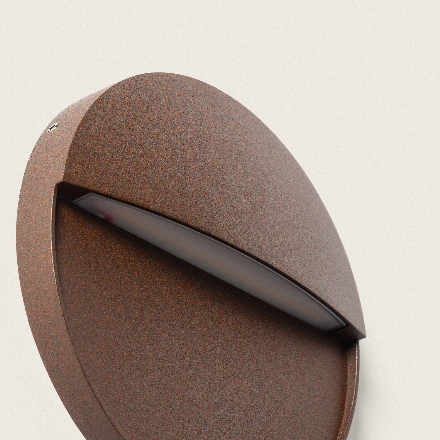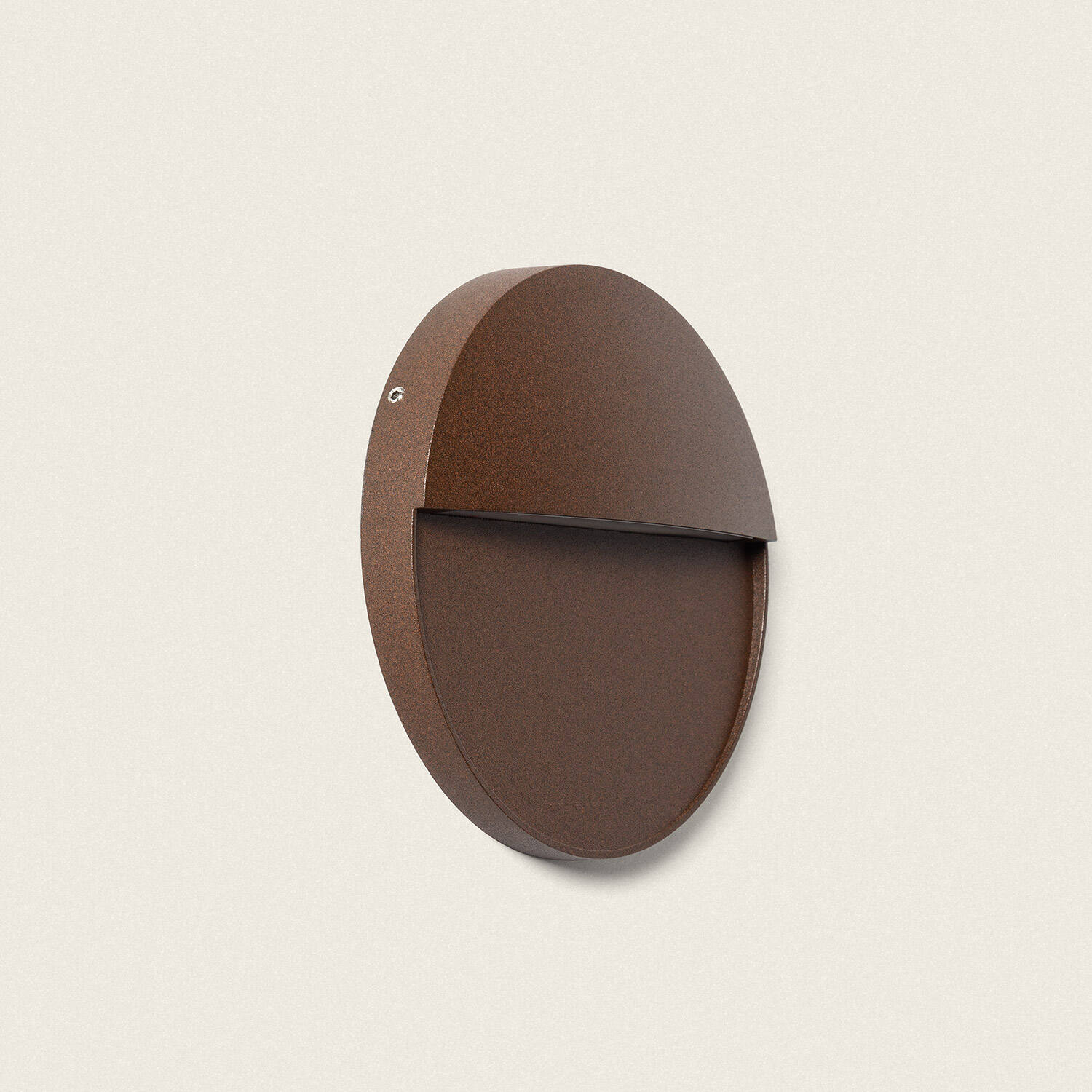 Son boîtier en aluminium au profil bas de 32 mm et 160 mm de diamètre épouse façades contemporaines. La finition brun mat rehausse matériaux et volumes sans ostentation, tandis que la forme ronde et la découpe frontale dissimulent la source pour un rendu lumineux harmonieux et discret.