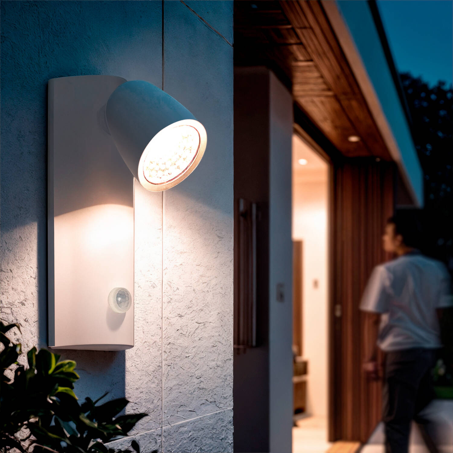 Le détecteur PIR intégré détecte les mouvements jusqu’à 10 mètres, activant immédiatement l’éclairage pour sécuriser entrées et allées. Ce fonctionnement automatique réduit les interventions manuelles et optimise la consommation, tout en offrant une présence lumineuse précise grâce au faisceau angulaire maîtrisé de 24°.