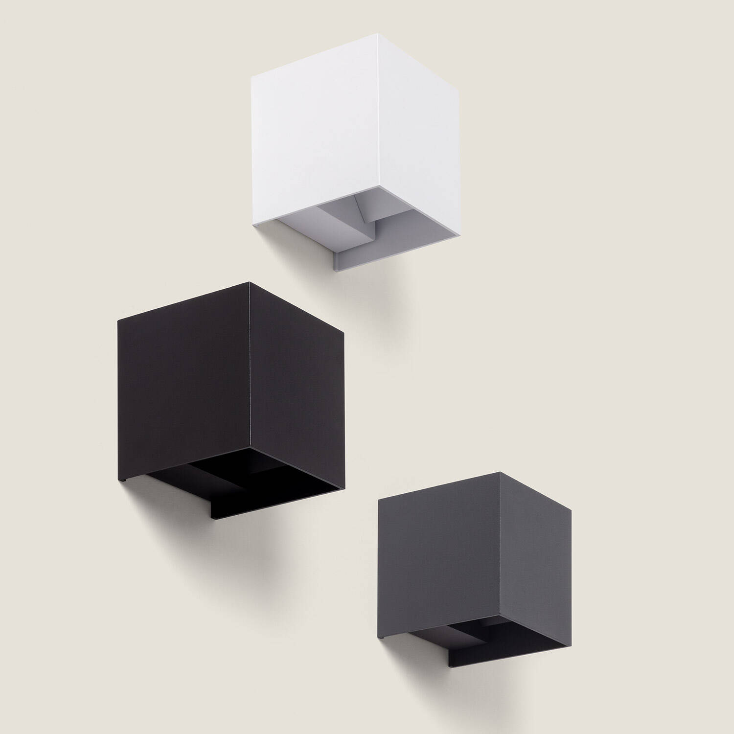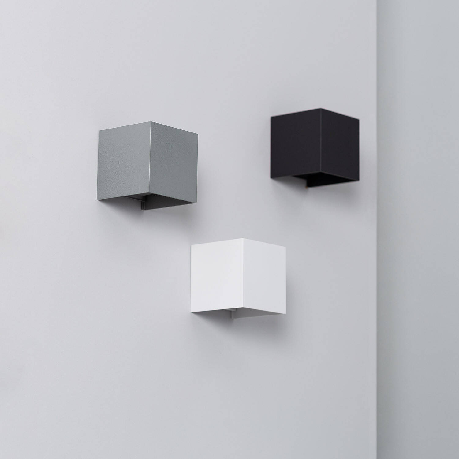 L'applique mesure 100 mm de côté, forme cube compacte et finition en aluminium anodisé blanc. Sa petite taille la rend discrète tout en apportant une touche moderne. Selon les visuels elle existe également en autres finitions pour s'adapter à différents styles.
