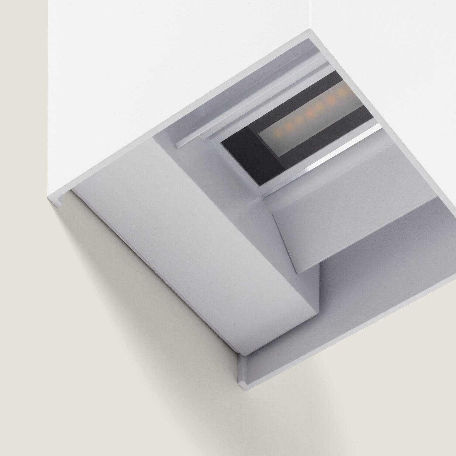 Son volume cubique de 100 mm de côté, réalisé en aluminium anodisé blanc, apporte une silhouette pure et contemporaine. Discrète en journée, l’applique affirme le style des façades modernes tout en respectant les proportions des entrées, patios et murs d’enceinte.