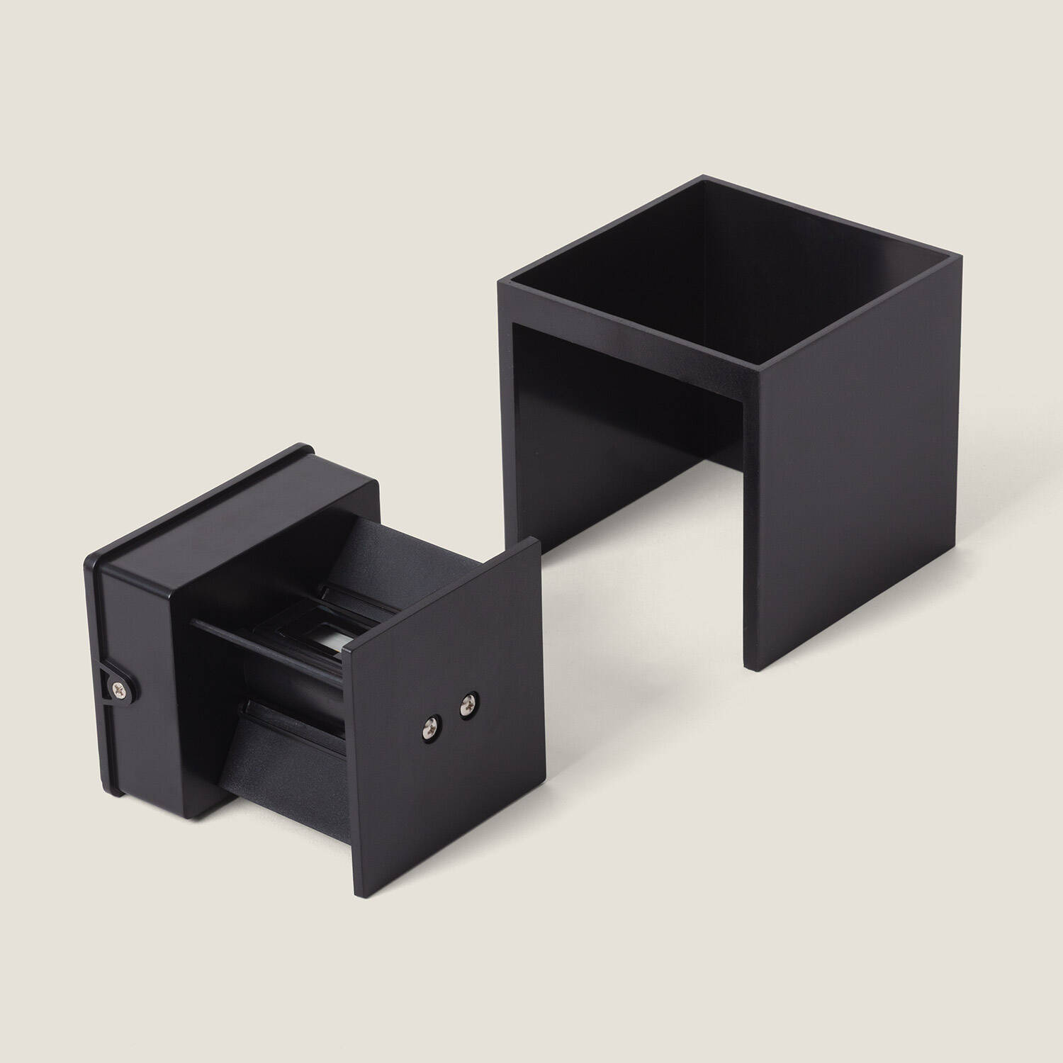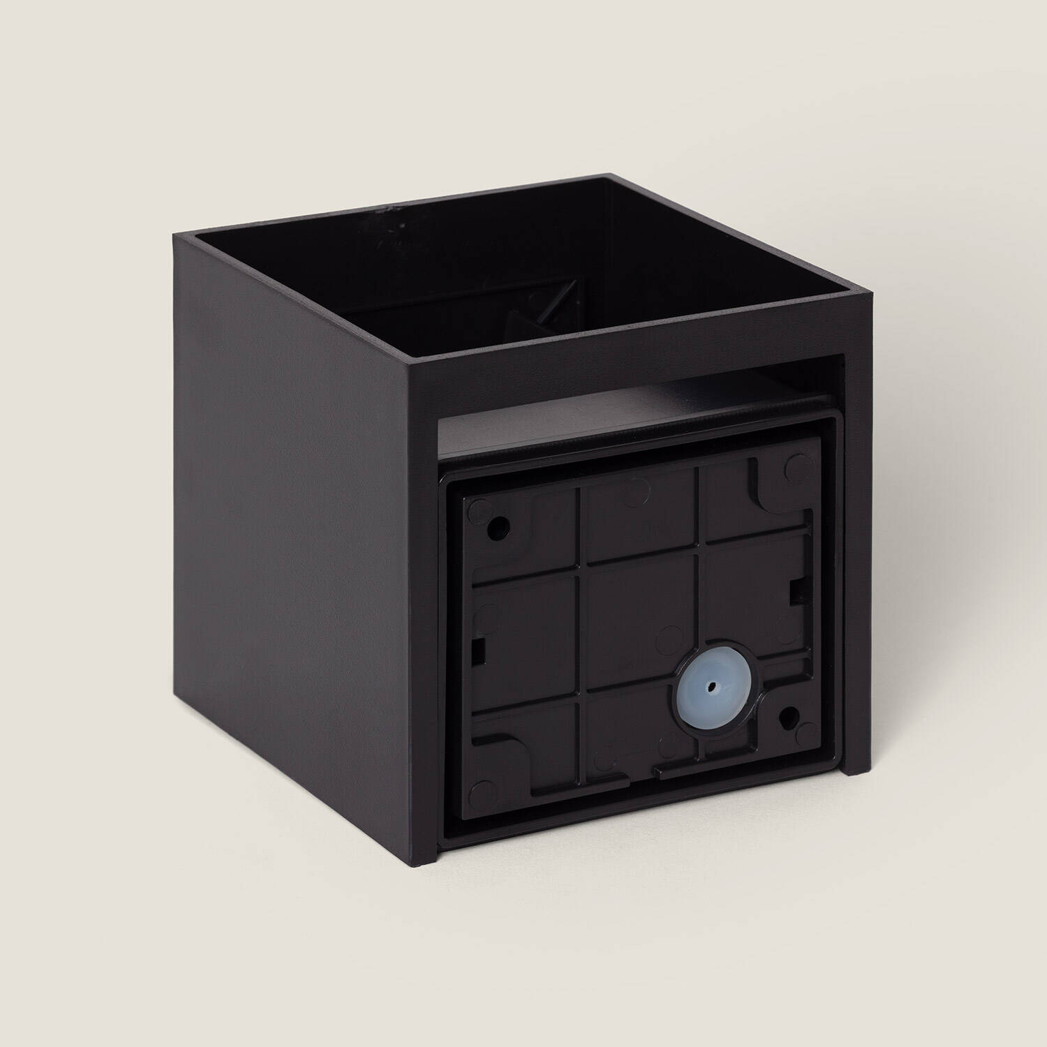 Son boîtier cubique de 100 mm, finition noire mate et lignes épurées confèrent à l’applique un caractère contemporain. Fabriquée en polycarbonate robuste, elle s’intègre aisément aux architectures modernes, sublimant murs et entrées sans surcharge visuelle, pour un rendu sobre et résolument premium.
