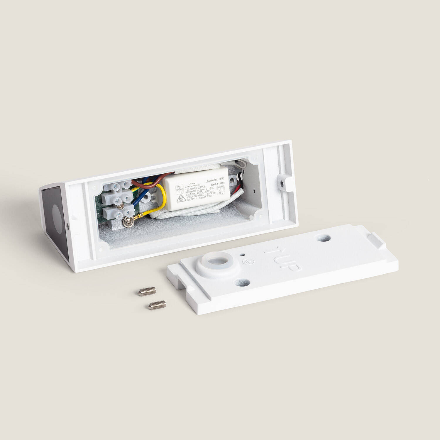 L'applique se fixe en surface sur mur et se branche sur une alimentation 220-240V AC. Les images montrent une platine de fixation et l'alimentation incorporée dans le boîtier. Nous recommandons de confier le raccordement électrique à un électricien et de couper le courant avant toute intervention.