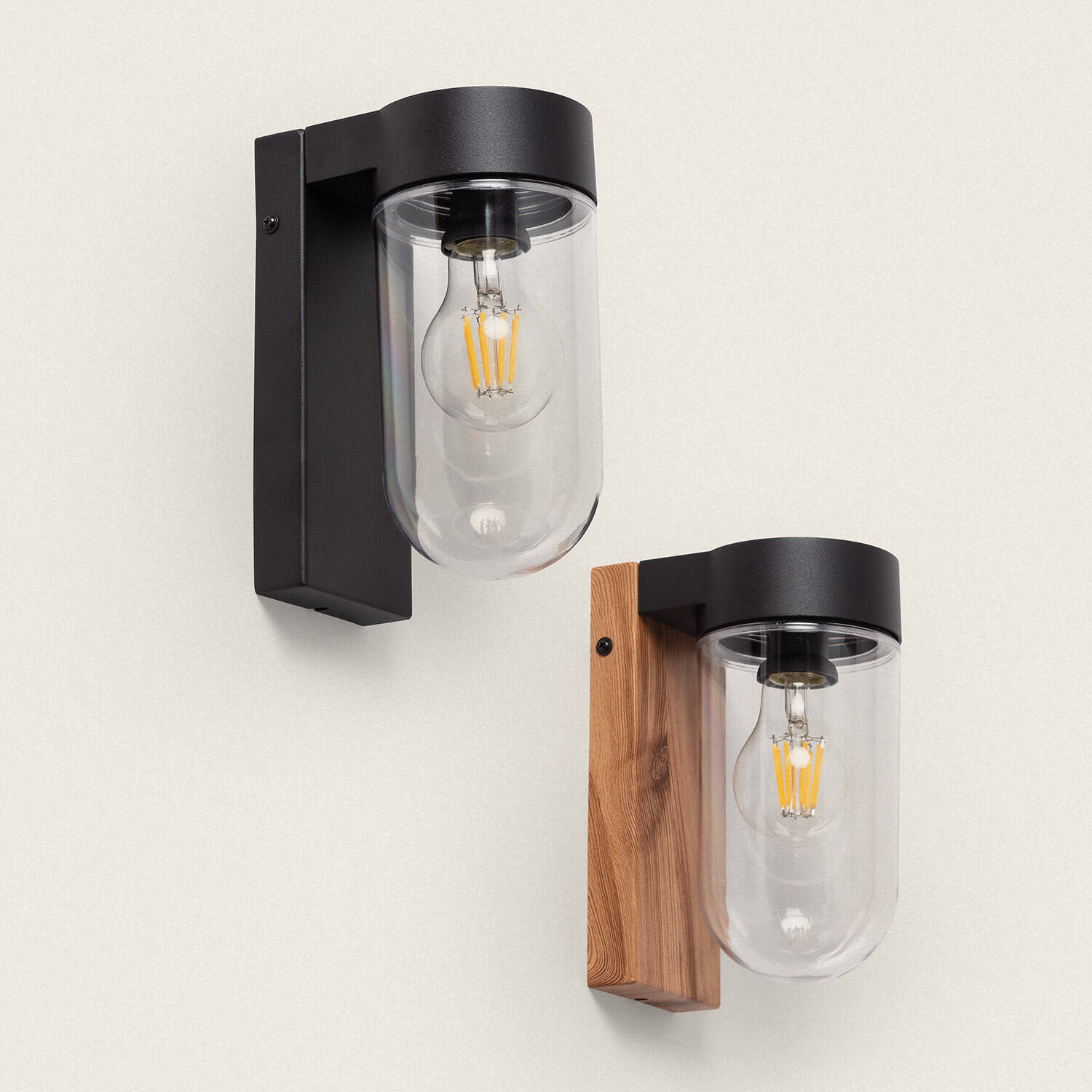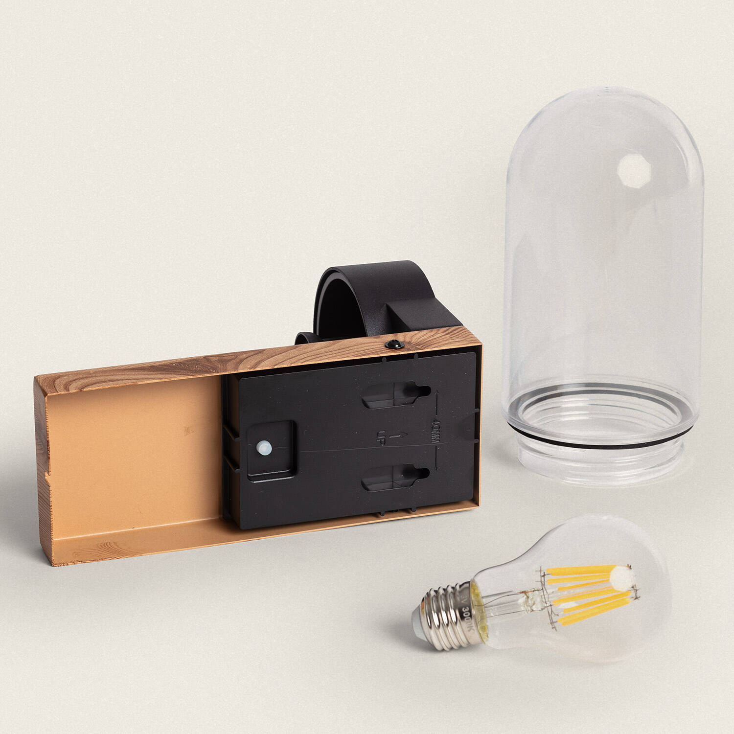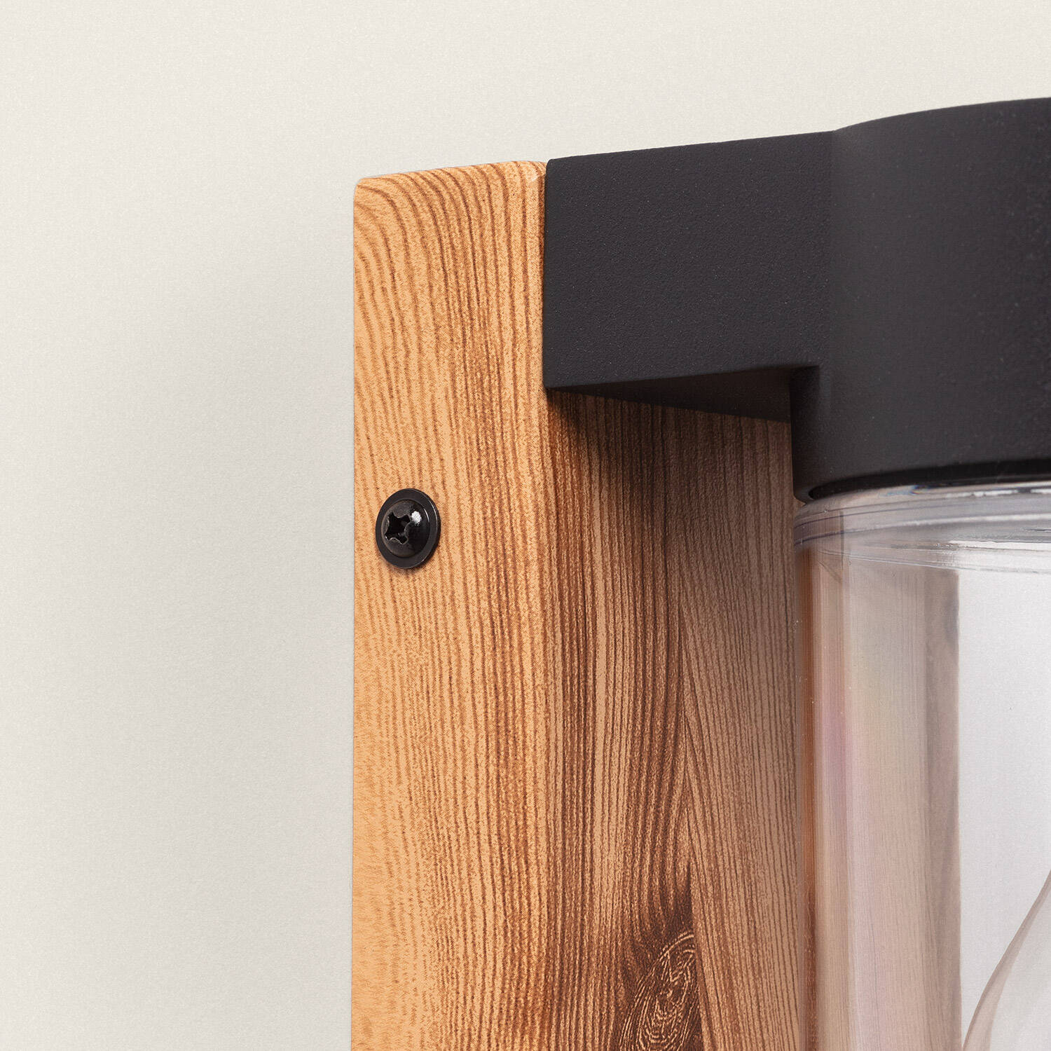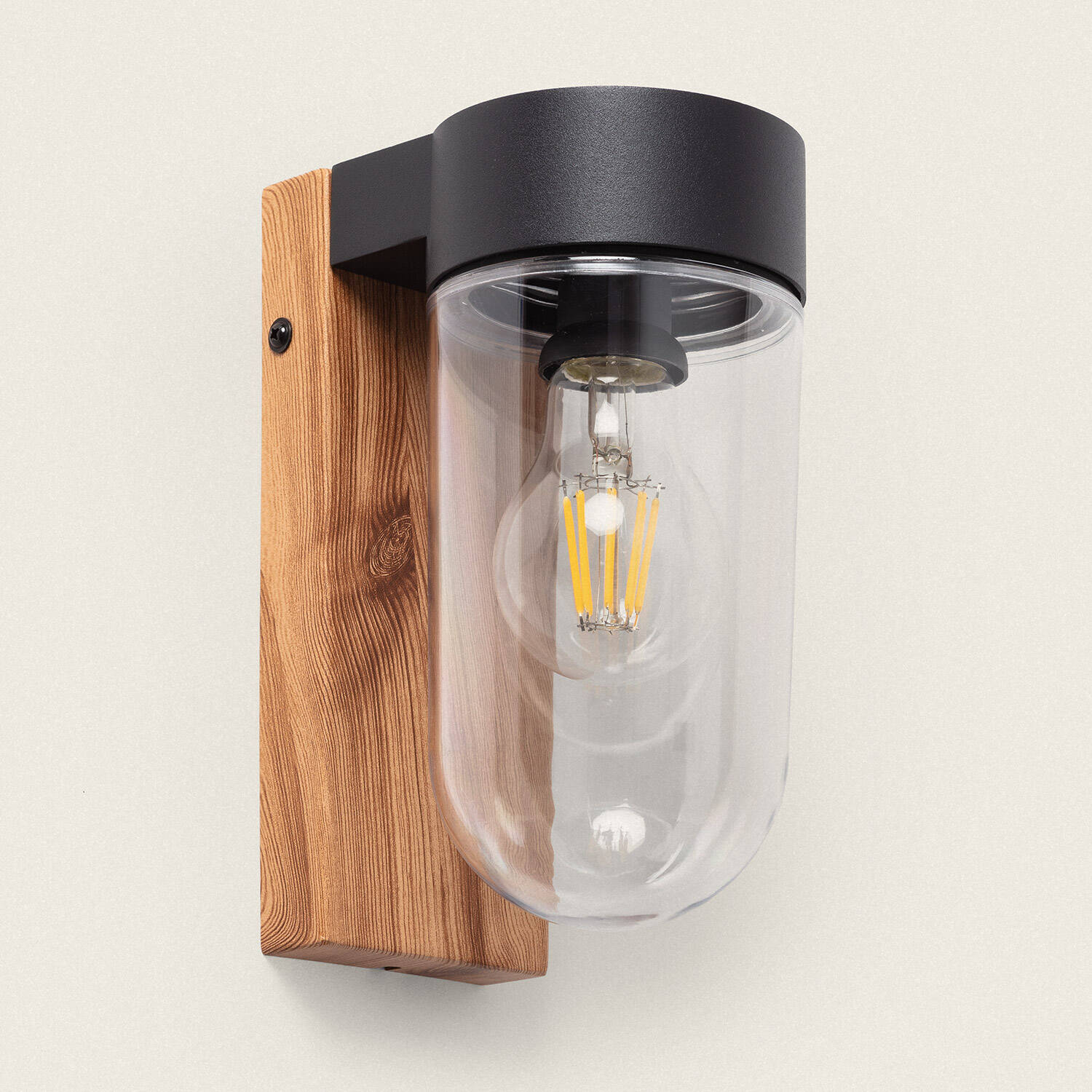 Le corps en aluminium au fini naturel se marie subtilement avec une plaque au rendu bois, créant une applique murale au style organique et contemporain. Le diffuseur en verre transparent met en valeur l’ampoule E27 fournie, conférant une présence élégante et accueillante.