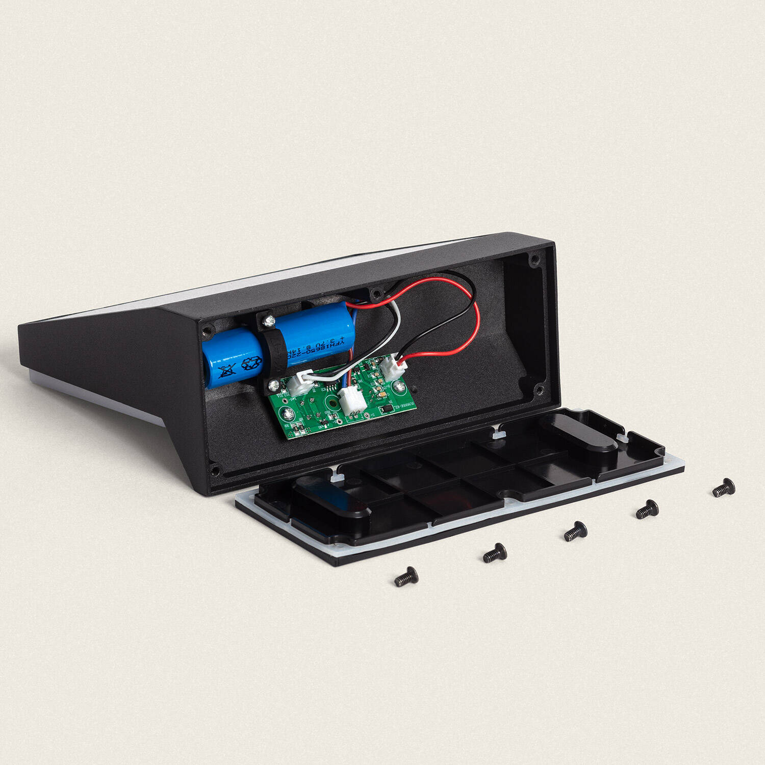 La fiche technique indique que la batterie n'est pas fournie. L'applique est conçue pour des accus 18650 rechargeables 3,7 V et la capacité compatible est 2200 mAh. Le compartiment batterie est accessible en retirant la face arrière et permet un remplacement manuel en respectant la polarité.