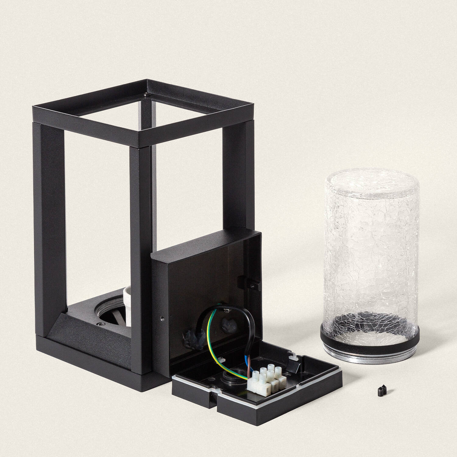 Pour préserver la finition aluminium noire et le diffuseur en verre craquelé, nettoyez avec un chiffon doux légèrement humide et un savon neutre si nécessaire. Évitez les produits abrasifs, solvants ou jets d'eau à haute pression. Vous pouvez démonter délicatement le cylindre en verre pour le nettoyer et bien le sécher avant de remonter. Vérifiez régulièrement les vis et les joints pour maintenir l'étanchéité.