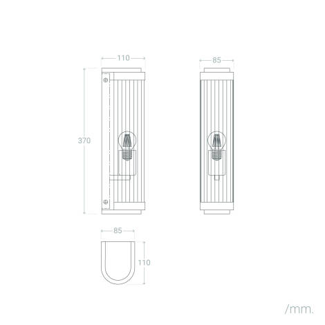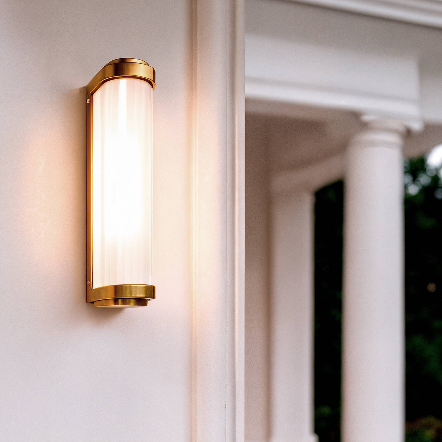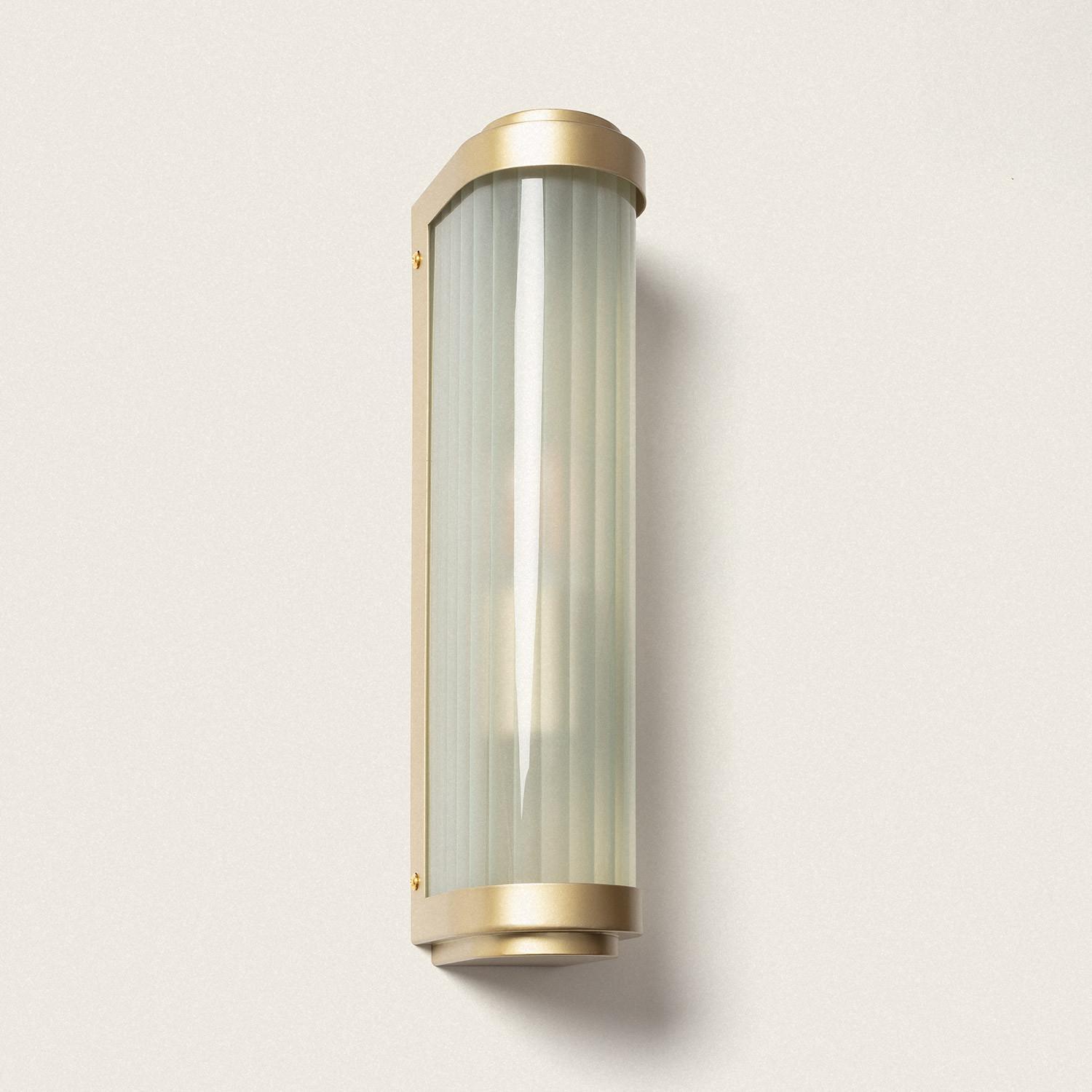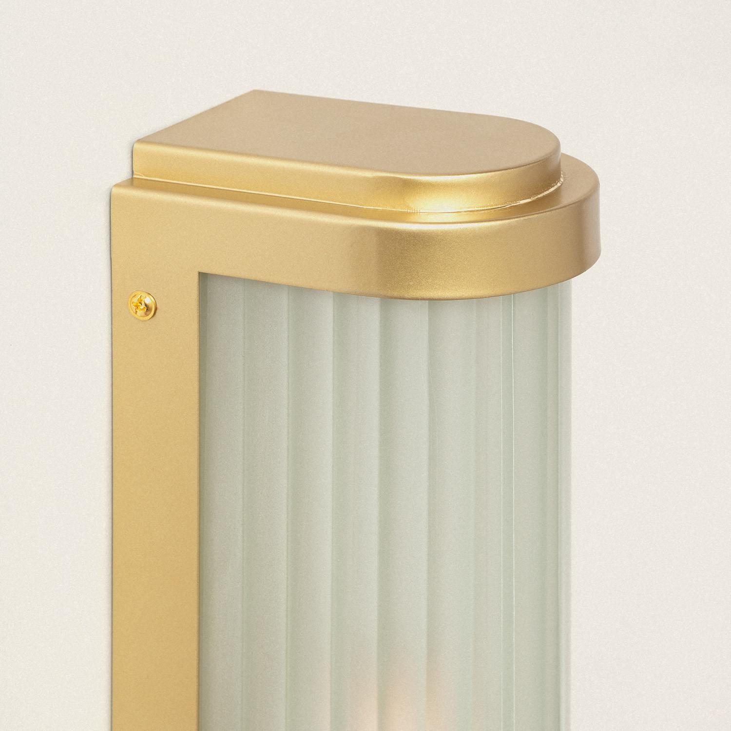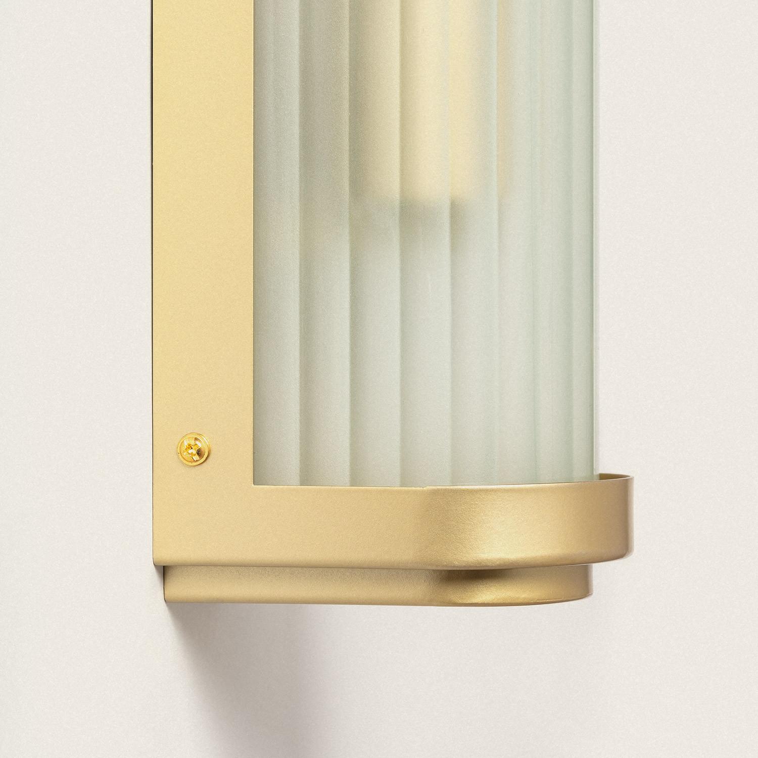 L’abat-jour en verre opalin aux lignes verticales crée une texture sophistiquée et diffuse la lumière de façon homogène. Le fini doré du support métallique apporte une note luxueuse sans ostentation, parfaite pour des façades modernes ou des intérieurs au style soigné.