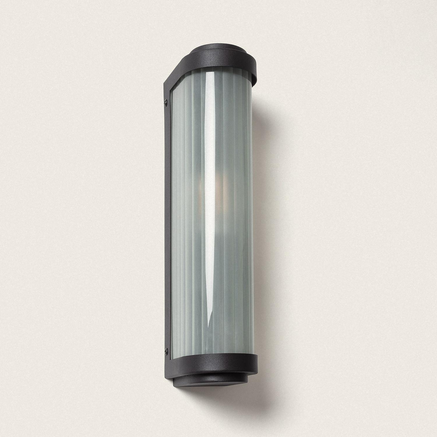 Dimensions principales poids 1.35 kg longueur 110 mm hauteur 370 mm largeur 85 mm. Le design vertical avec verre cannelé est prévu pour être fixé verticalement comme sur les photos, idéalement près d'une porte ou le long d'une façade pour un éclairage d'appoint et d'ambiance.