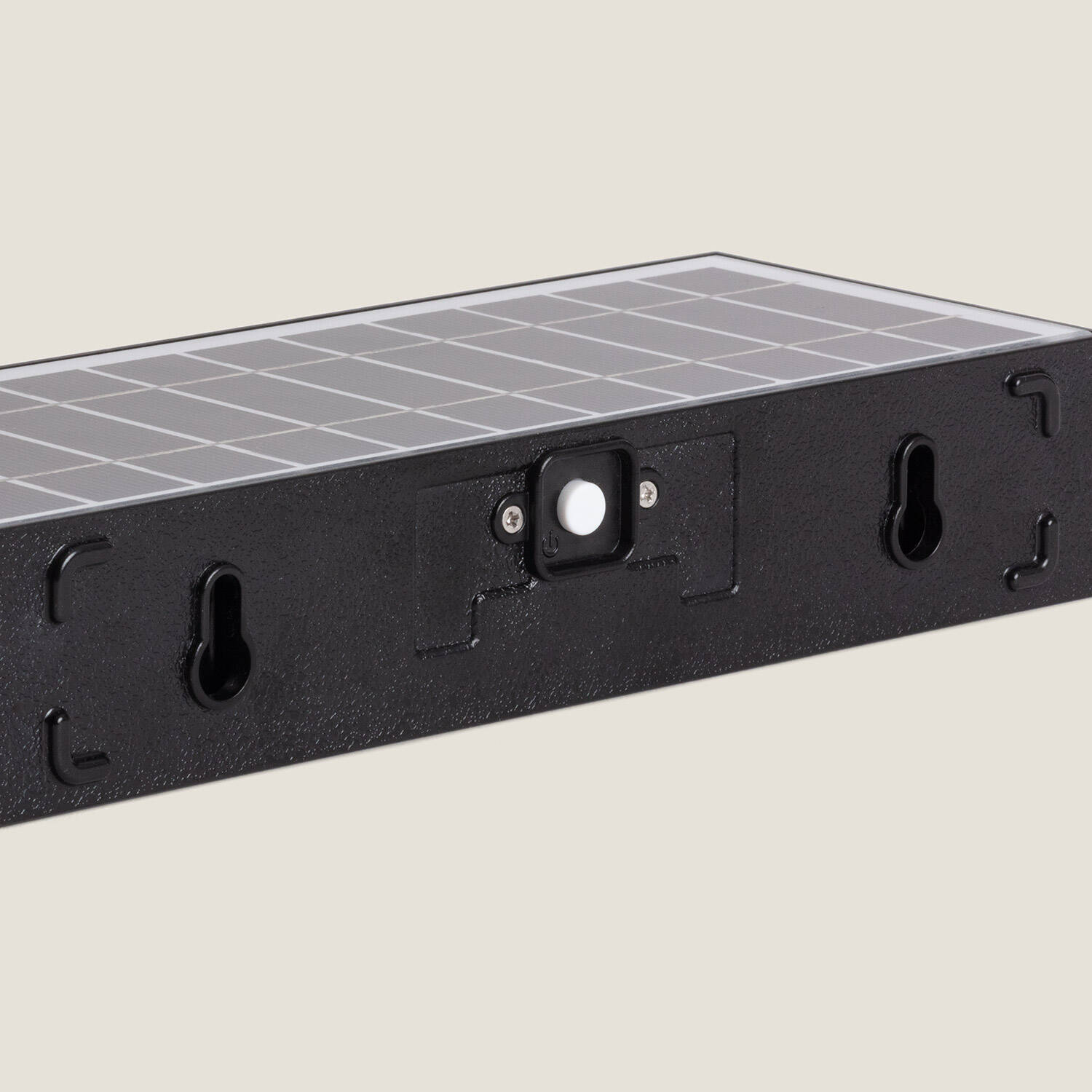 Installation murale simple avec deux vis en utilisant les deux orifices en clé visibles au dos. Positionner la face solaire vers le ciel sans ombrage direct pour optimiser la charge. Fixer sur une surface stable et verifier que le détecteur PIR n'est pas obstrué. Aucune alimentation filaire n'est requise.
