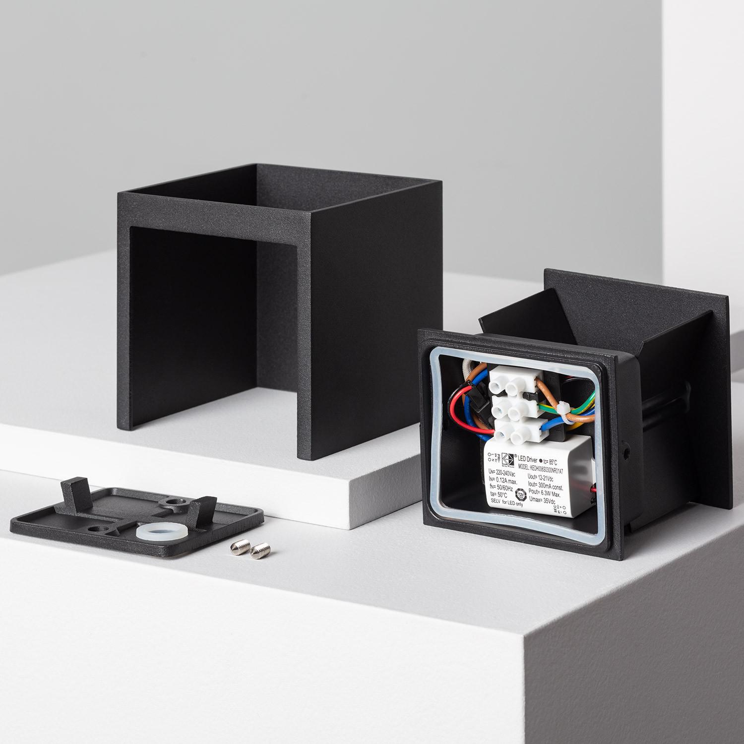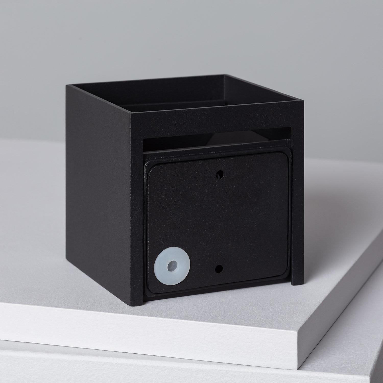 Son format compact de 100 mm s’intègre discrètement aux architectures modernes, tandis que la finition noire en aluminium résiste aux épreuves du temps. Cet équilibre entre simplicité géométrique et qualité de fabrication apporte une présence sobre, idéale pour terrasses, entrées et couloirs extérieurs.