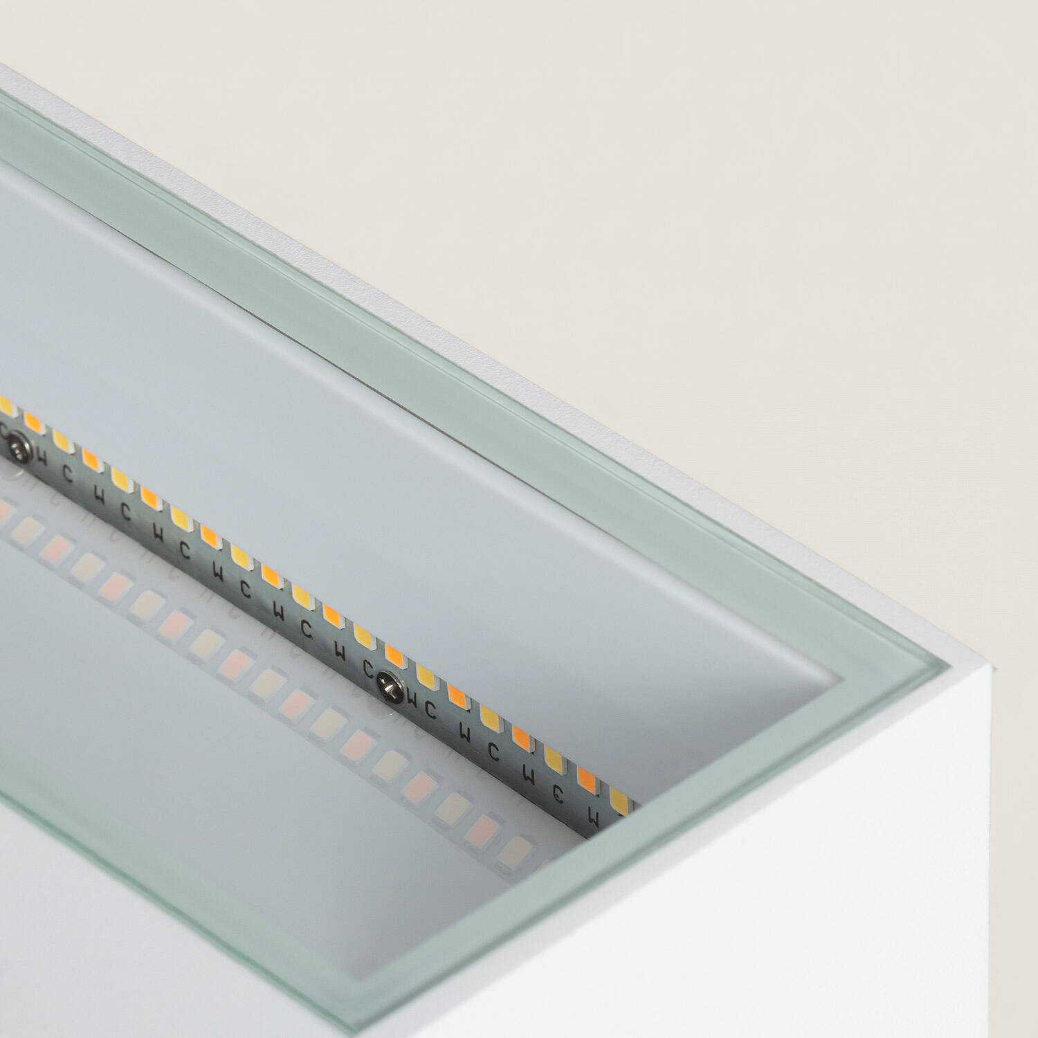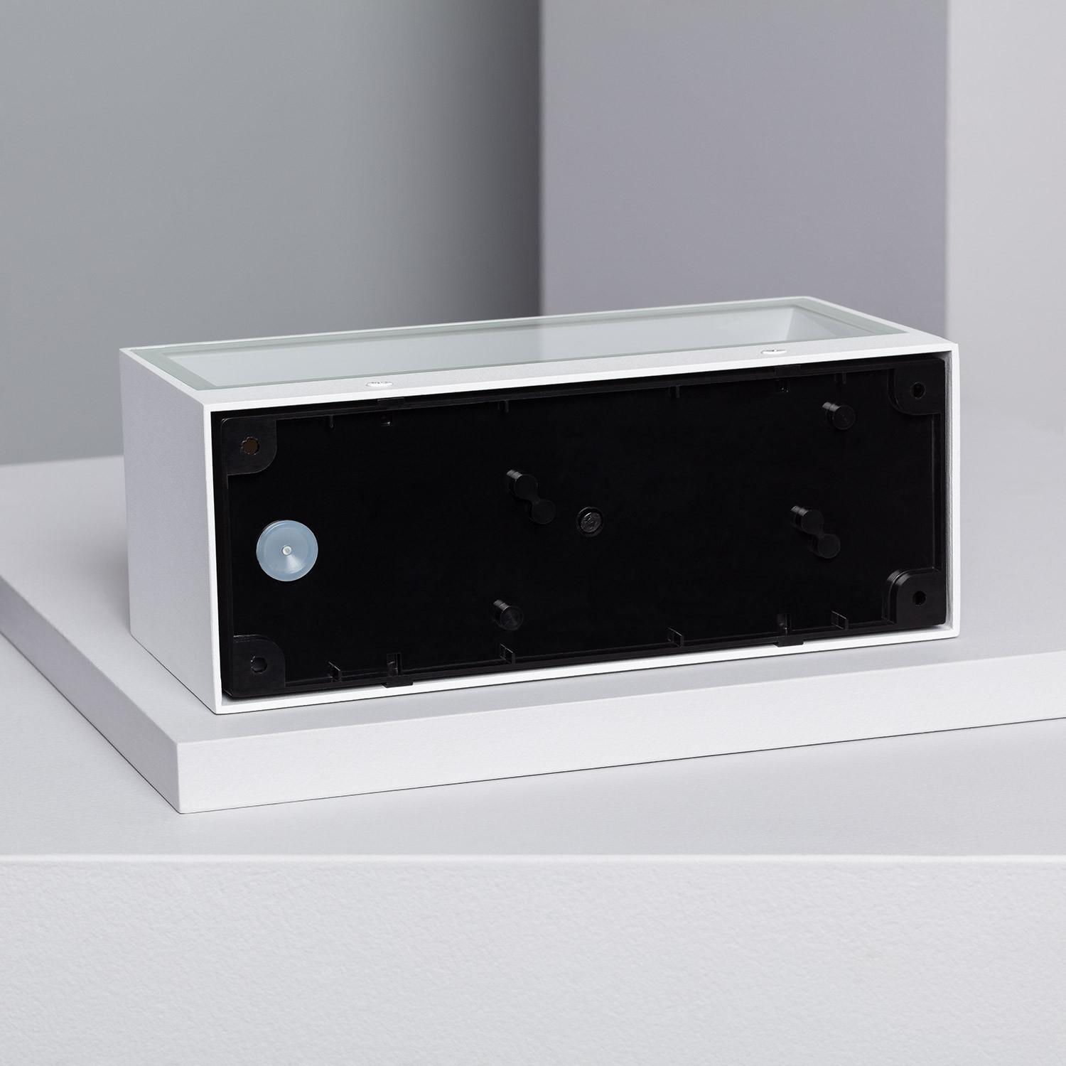 Le boîtier blanc en aluminium offre une finition raffinée et contemporaine, pensée pour s’intégrer discrètement aux architectures modernes. Ses lignes géométriques soignées valorisent murs et entrées tout en conservant un profil compact, idéal pour des installations esthétiques et durables et facile à associer.