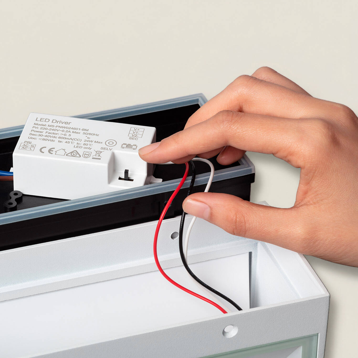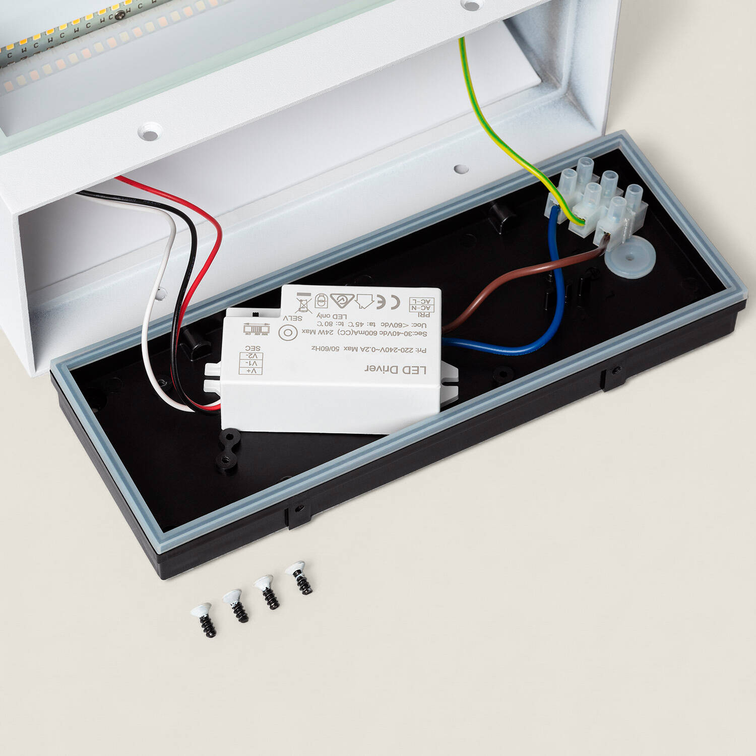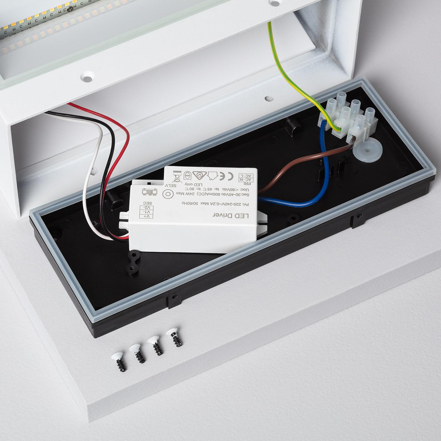 L'applique se fixe en surface sur mur et fonctionne sur 220-240 V AC 50-60 Hz. Les images montrent un boîtier de connexion avec driver et bornier pour les fils phase neutre terre. Pour garantir une installation conforme et sécurisée, nous recommandons de faire intervenir un électricien qualifié.