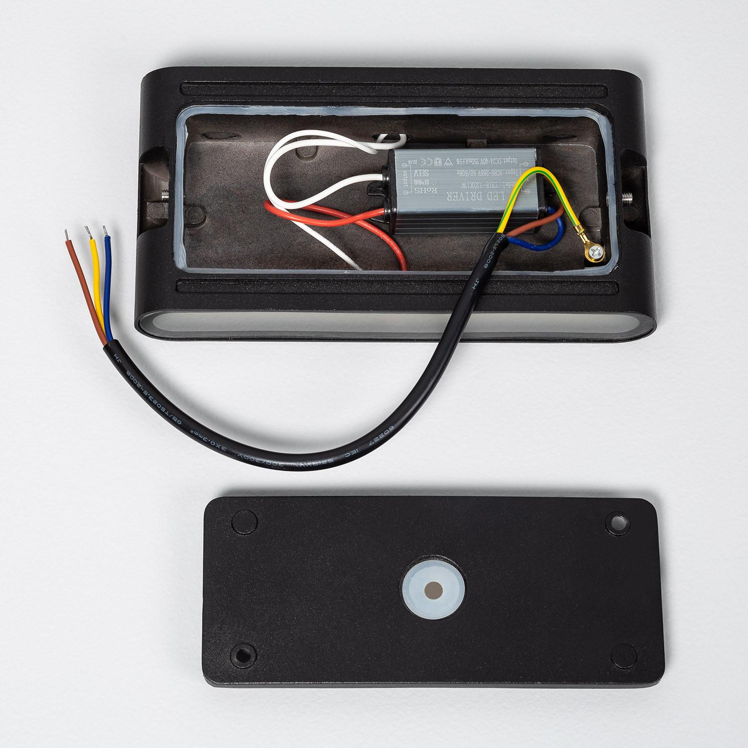 L'applique se monte en surface sur mur à l'aide de la plaque arrière visible sur les photos. Coupez le courant, fixez la plaque, raccordez les fils au réseau 220-240V par un électricien qualifié puis repositionnez le cache et refermez. Les images montrent le câble et le driver inclus pour une pose sans boîtier encastré.