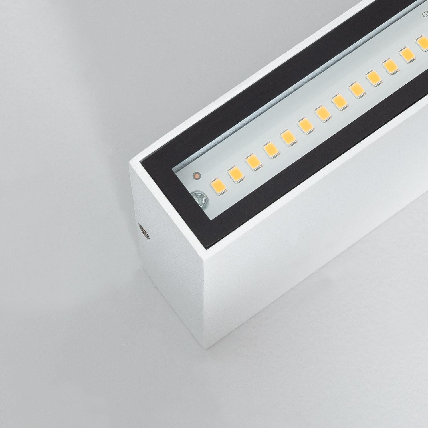 L'applique intègre des LED (60 LED, rendement 120 lm/W) délivrant environ 1200 lm en blanc neutre 4000K, créant un effet up & down double face idéal pour façades et entrées. Les LED sont intégrées au luminaire, l'ampoule n'est pas remplaçable séparément. Durée de vie estimée 40 000 heures.