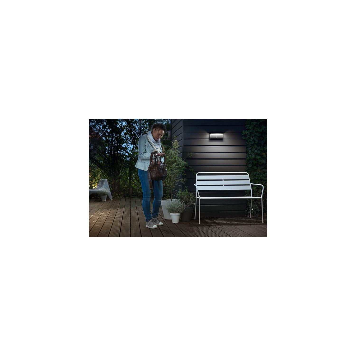 L’applique murale LED extérieure PHILIPS Bustan avec détecteur de mouvement offre un éclairage d’accueil fiable et élégant pour entrée, terrasse ou allée. Son design anthracite en aluminium s’intègre facilement aux façades modernes, tandis que sa lumière blanc froid de 1000 lm et sa protection IP44 assurent confort et sécurité au quotidien.