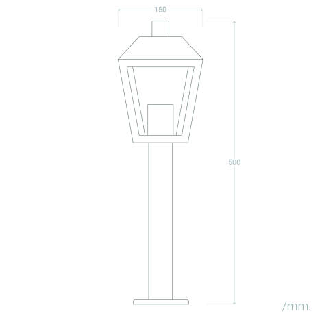 La balise mesure 500 mm de hauteur avec une tête d'environ 150 mm sur 150 mm. Sa hauteur de 50 cm en fait un éclairage d'ambiance et de balisage idéal pour allées et petites terrasses, tout en restant discrète et élégante grâce à sa finition aluminium noire.