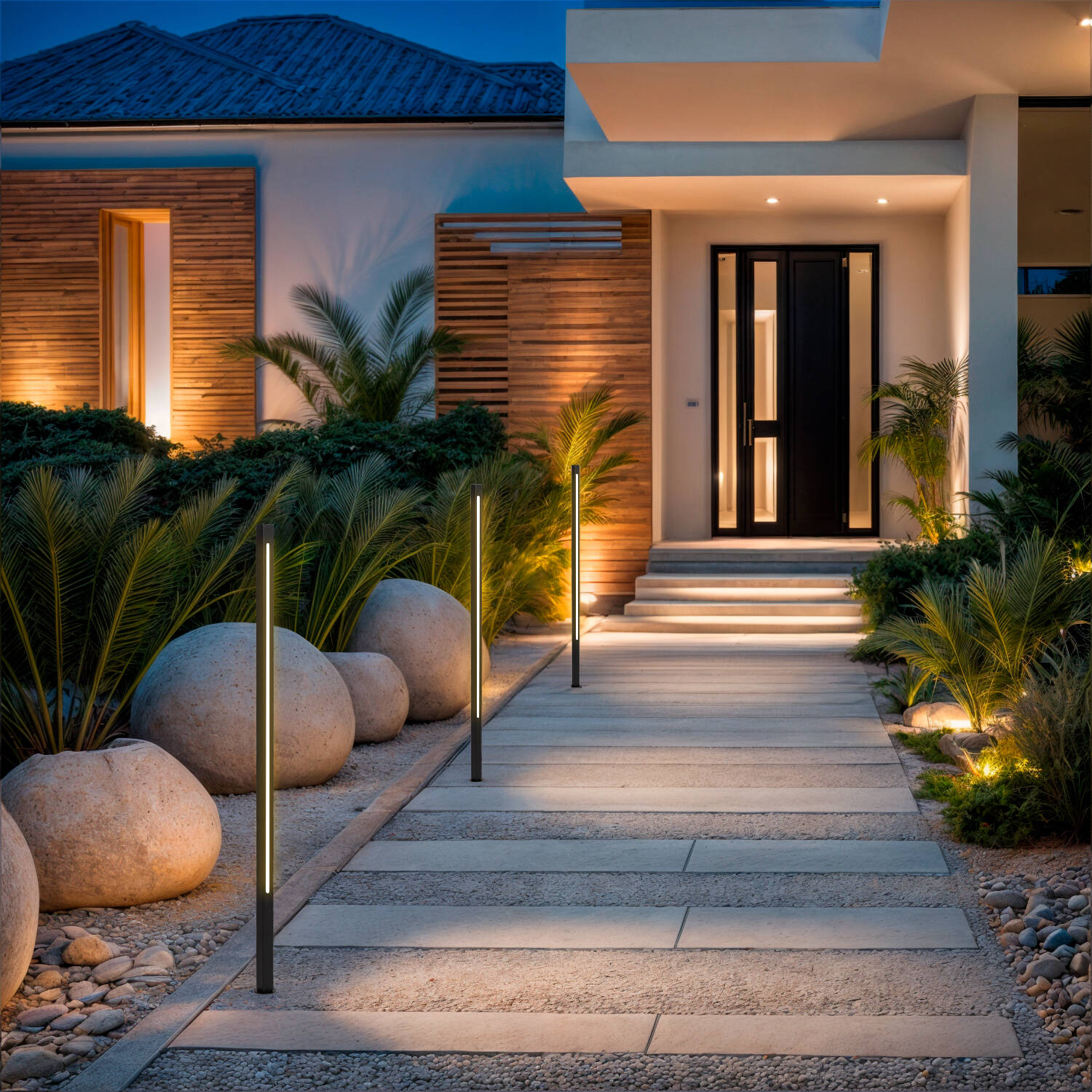 Profil mince et finition noir mat offrent une silhouette contemporaine qui s’intègre facilement aux jardins modernes. La colonne verticale diffuse une bande lumineuse uniforme, sublimant chemins et terrasses sans nuire à l’esthétique paysagère, pour un rendu discret et haut de gamme adapté à l’éclairage extérieur.