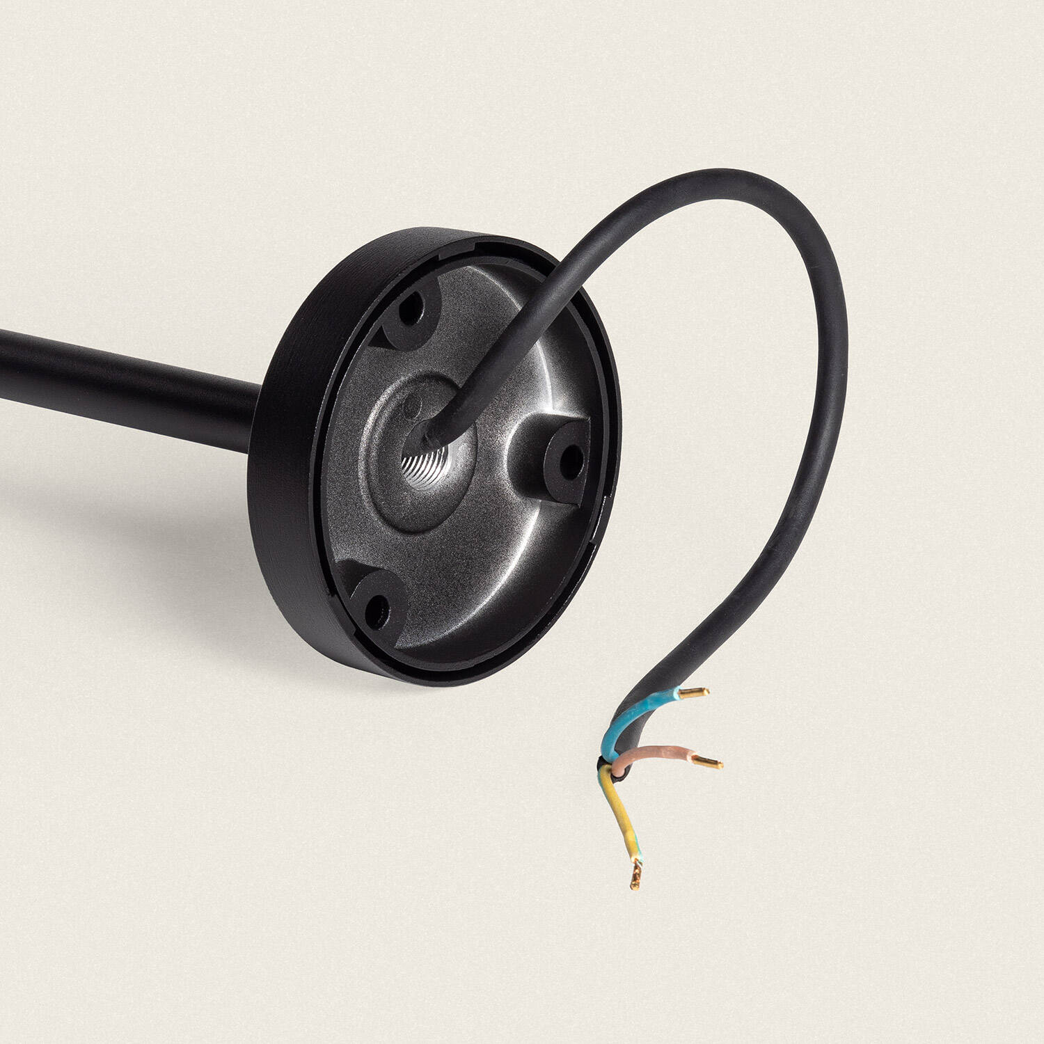 Cette balise se fixe en surface via sa base circulaire munie de trous de fixation visibles sur les photos. Le câble livré présente trois conducteurs pour une connexion directe au réseau 220-240V AC. L'appareil est de classe d'isolation I et nécessite une mise à la terre. Pour une installation sûre et conforme nous recommandons de confier le raccordement à un électricien qualifié et d'utiliser des vis et scellements adaptés au support.
