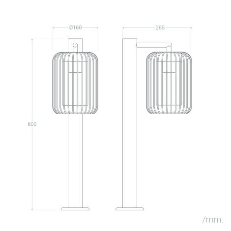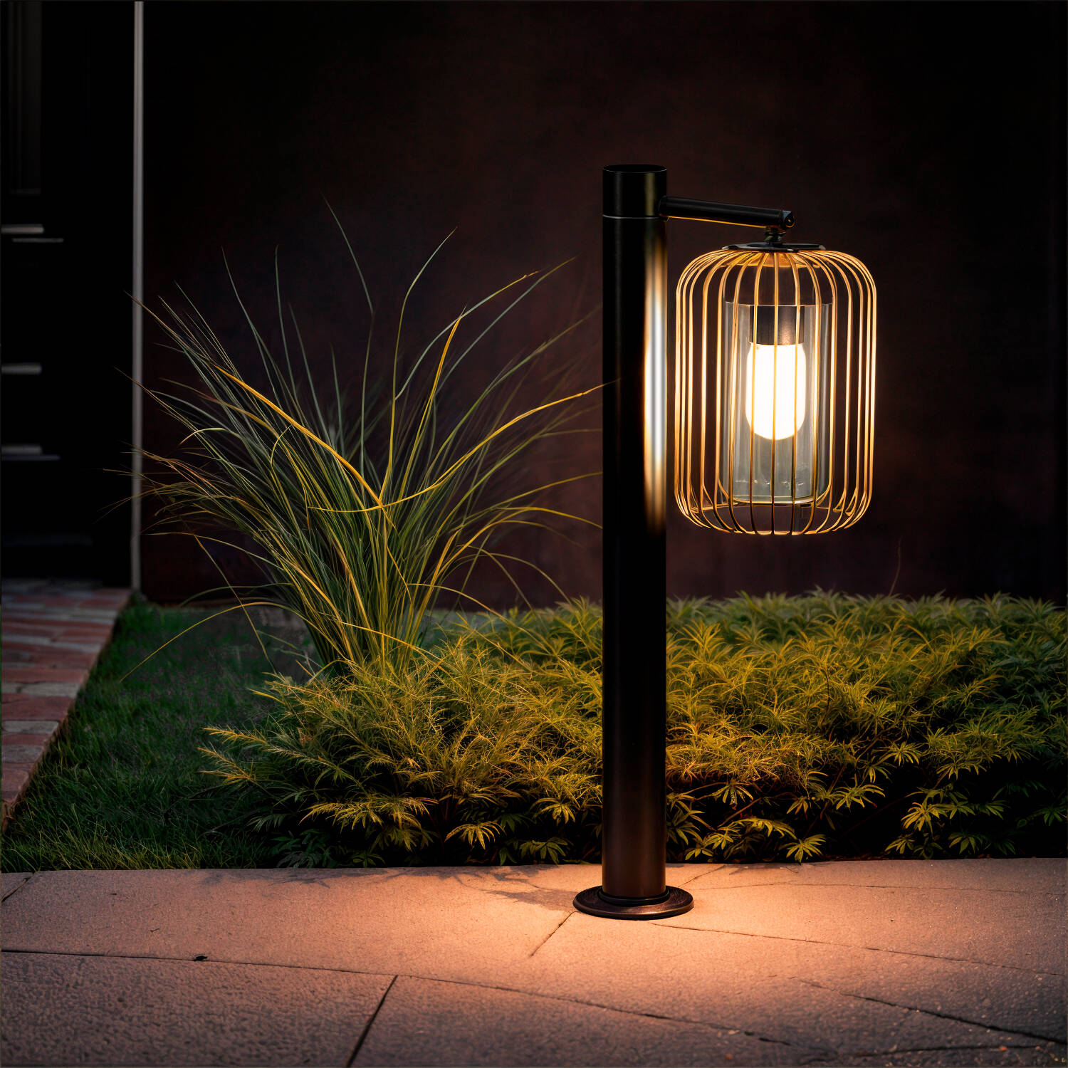 La cage métallique suspendue crée un jeu d’ombres raffiné autour d’une source lumineuse apparente, offrant à la fois caractère et discrétion. À 60 cm de hauteur, la balise s’intègre aux compositions paysagères pour mettre en valeur bordures, massifs ou terrasses avec une signature esthétique soignée.
