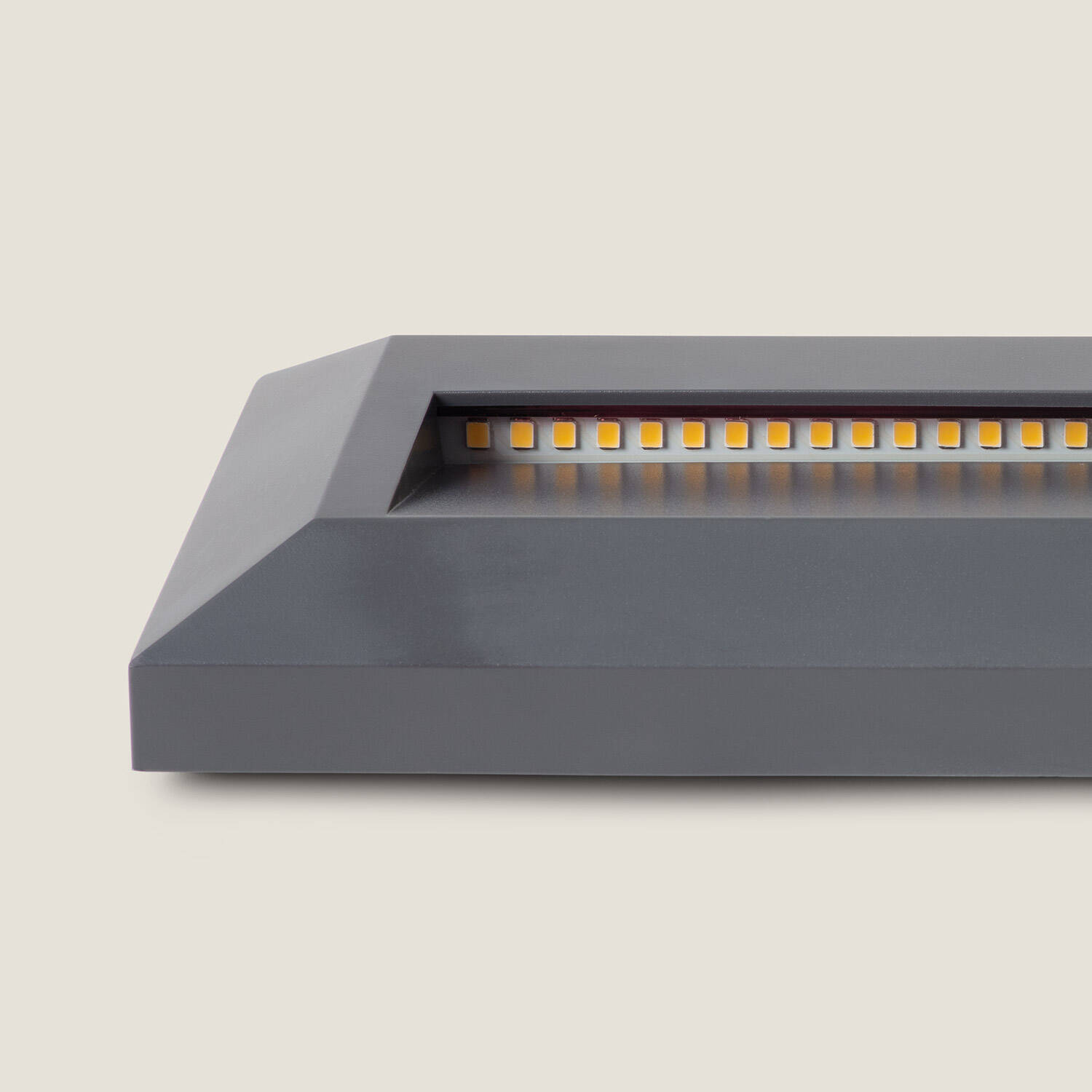 Son dessin rectangulaire épuré s’intègre naturellement aux façades contemporaines, apportant une touche architecturale discrète. Le corps en ABS et PC reprend la teinte grise pour un rendu uniforme, tandis que la lumière linéaire met en valeur les volumes sans nuire à l’esthétique du lieu.