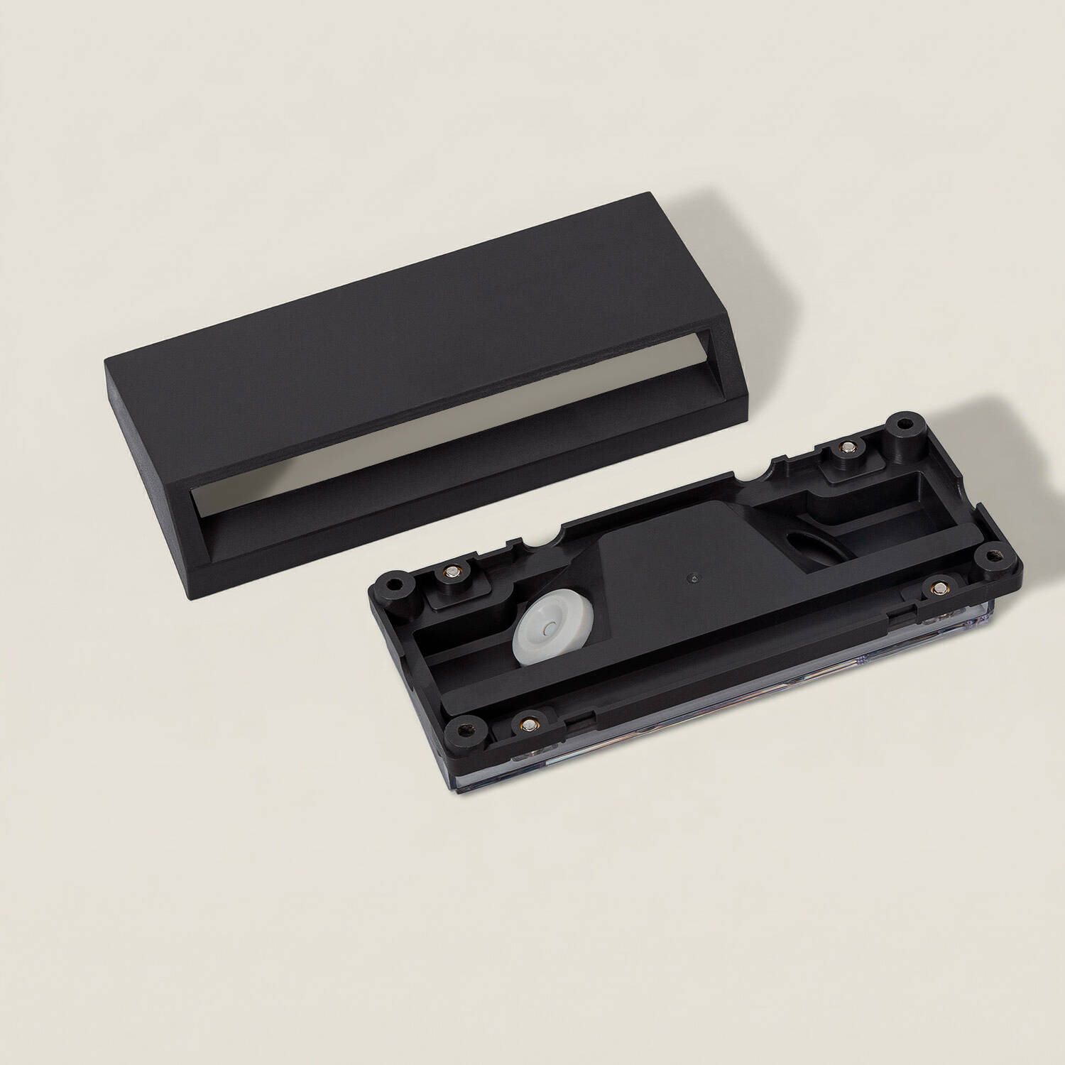 Le boîtier rectangulaire aux lignes épurées s’intègre naturellement aux façades contemporaines et traditionnelles. Sa finition anthracite confère une allure raffinée tandis que son format compact (160×70 mm) permet une installation en saillie soignée, respectant l’esthétique sans compromettre la qualité lumineuse.