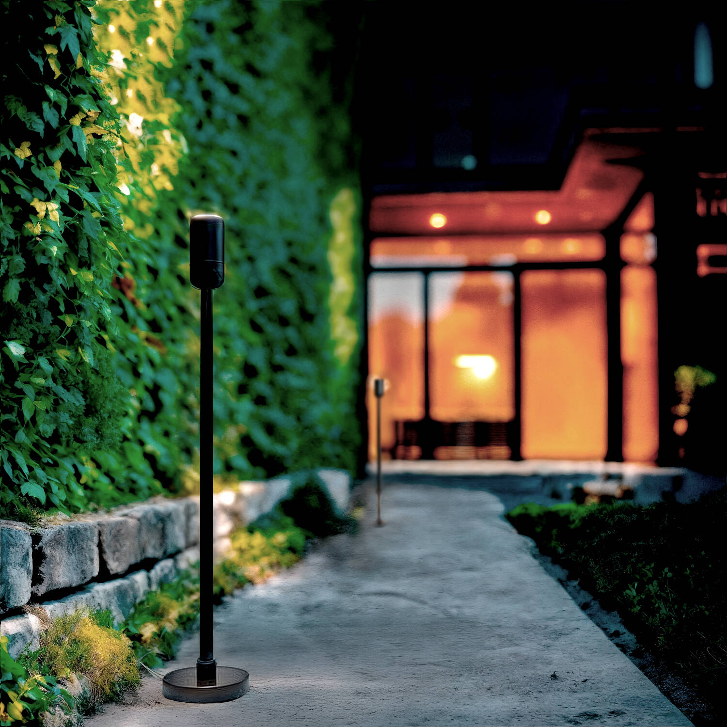 Sculptée dans un aluminium noir mat, la balise présente un profil élancé de 60 cm et un corps discret de 42 mm de diamètre. Son esthétique contemporaine s’intègre naturellement aux jardins modernes, terrasses ou façades, pour une finition raffinée et cohérente.