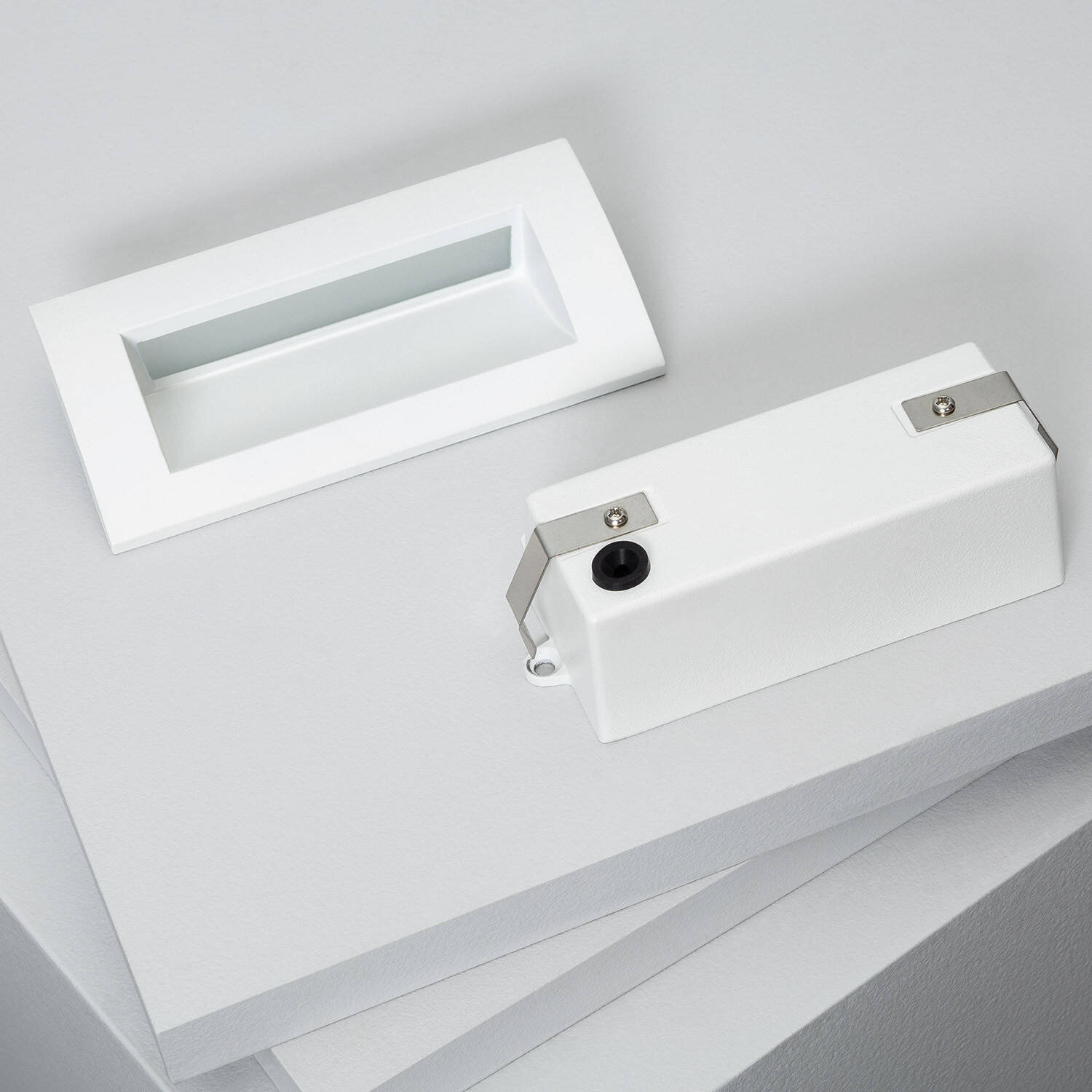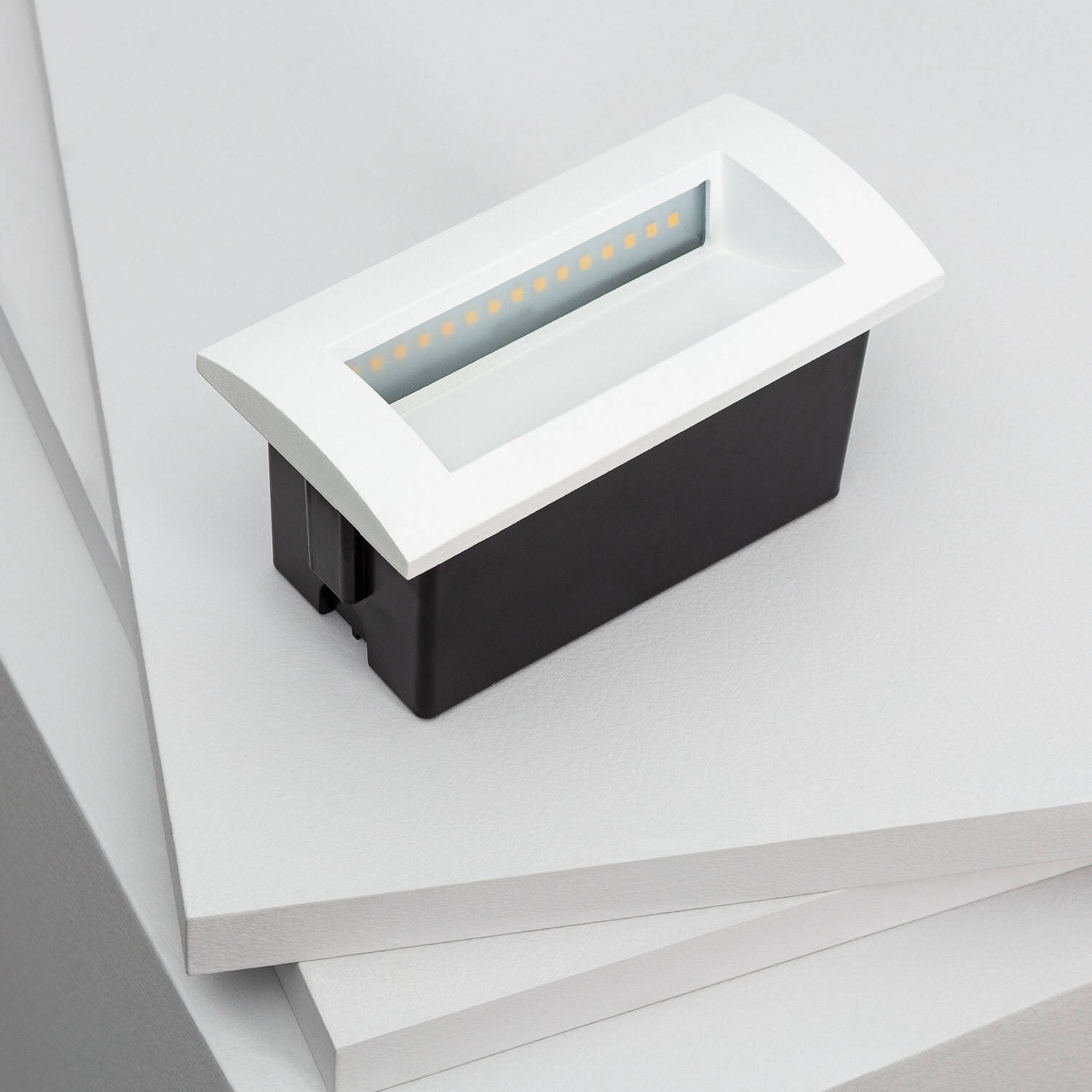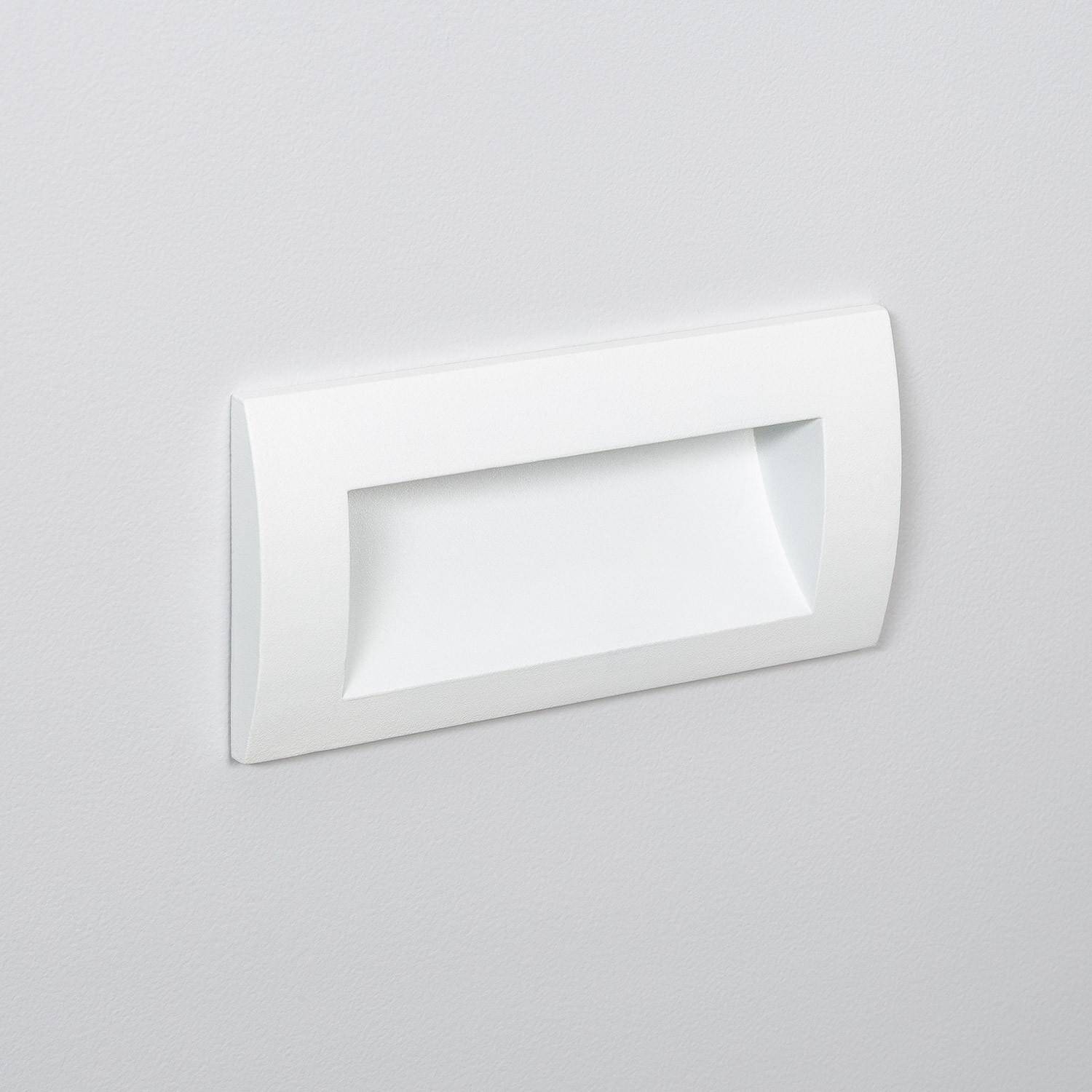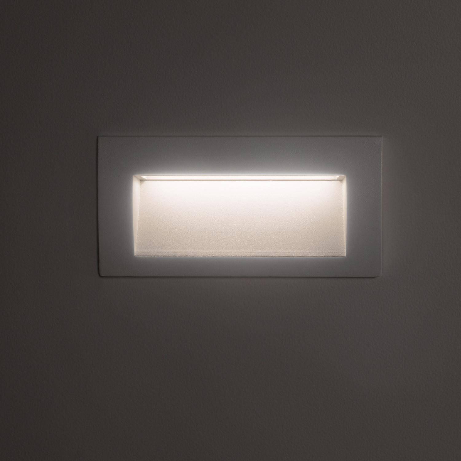Son profil rectangulaire blanc s’encastre parfaitement en mur, offrant une finition sobre et contemporaine. Les proportions compactes (140 x 70 x 70 mm) permettent des alignements précis pour créer des colonnes lumineuses régulières et valoriser les volumes architecturaux sans empiéter sur la façade.