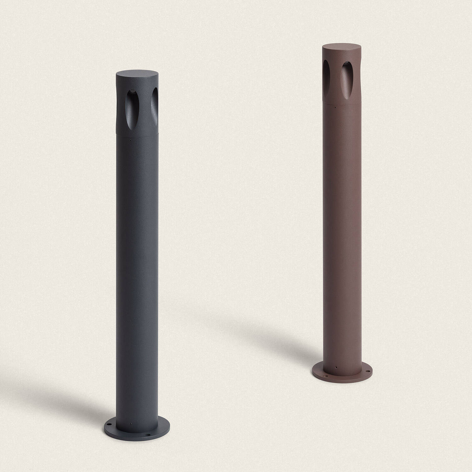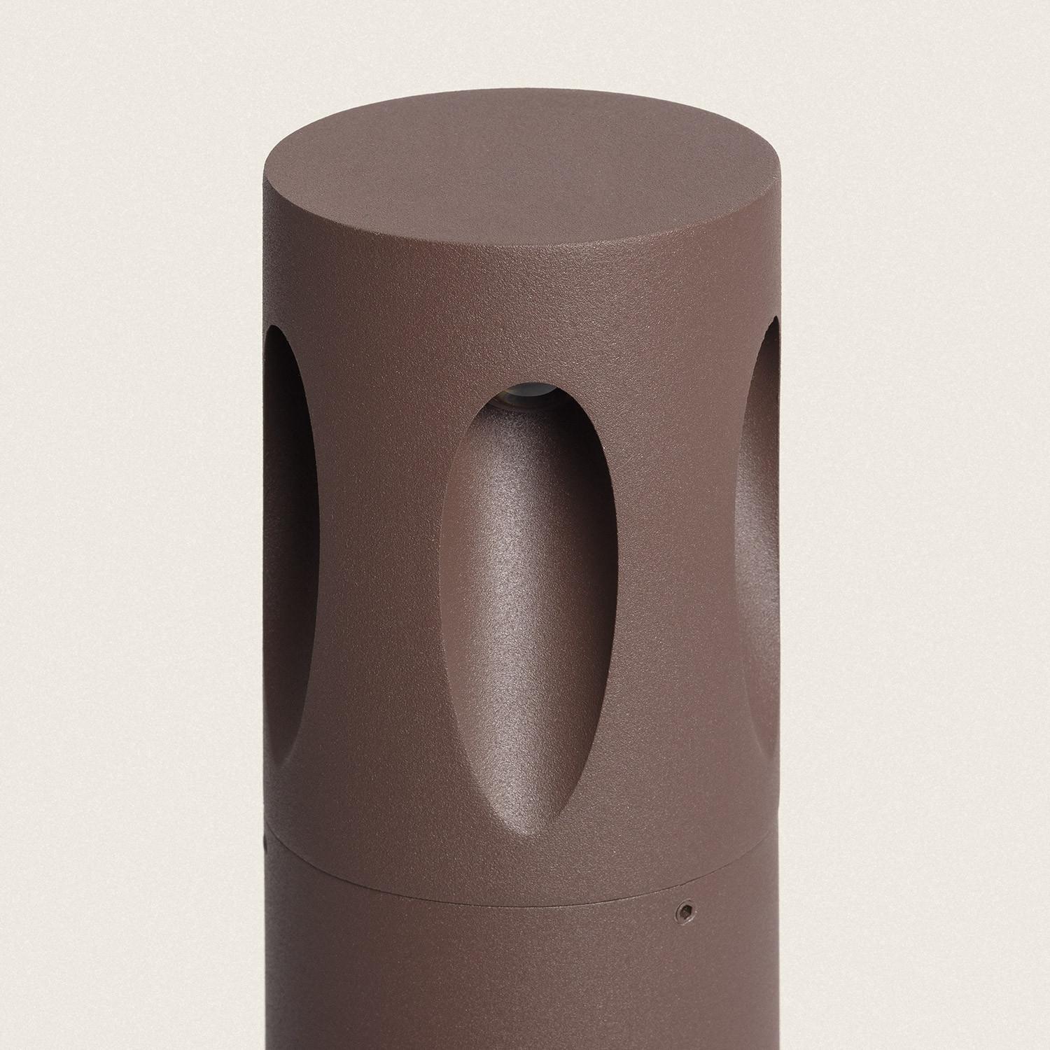 Son cylindre en aluminium au diamètre contenu apporte un rendu épuré et raffiné, la teinte rouille s’intègre naturellement aux matériaux extérieurs. Les découpes lumineuses en tête créent un graphisme subtil et diffusant, sublimant allées et terrasses sans nuire à l’harmonie paysagère.
