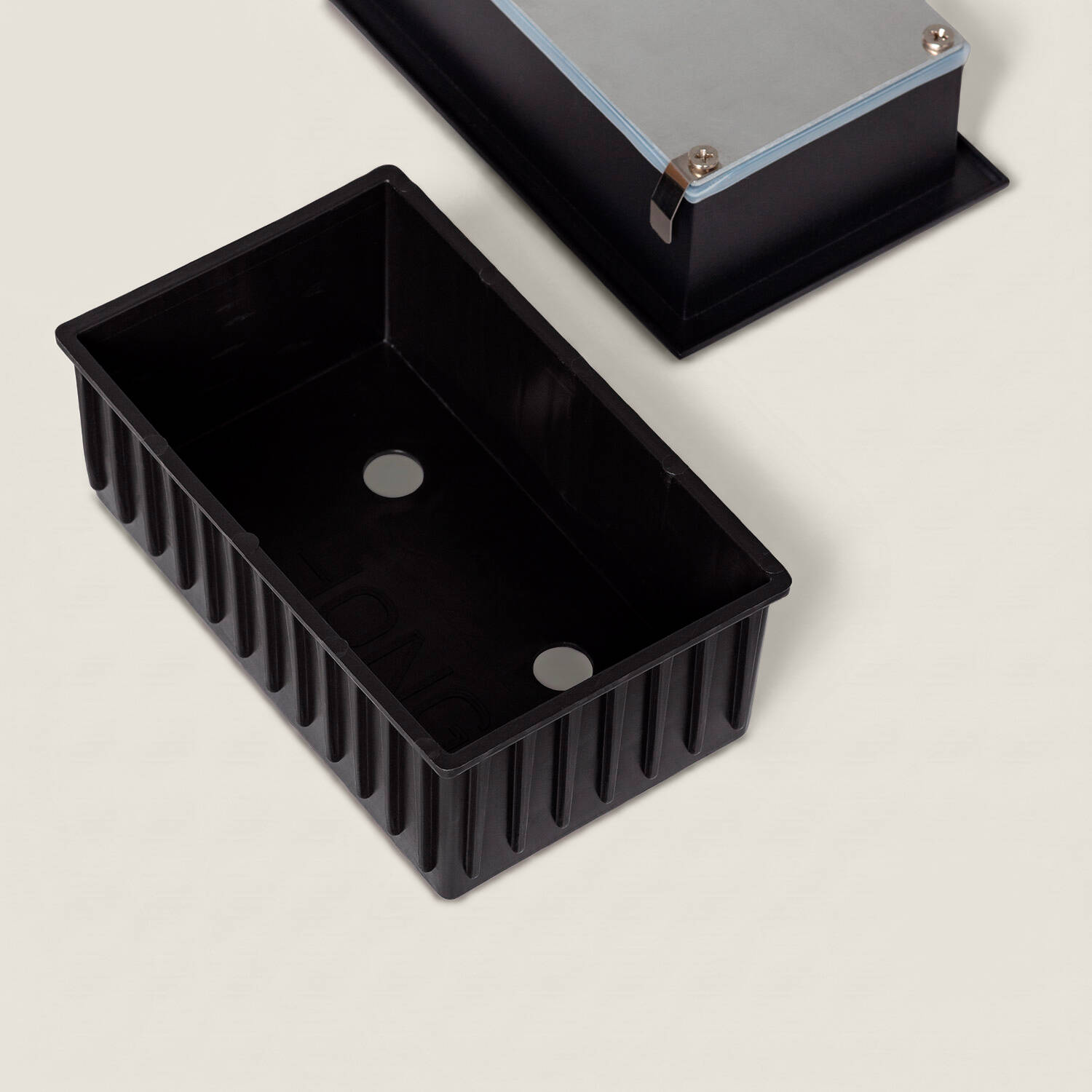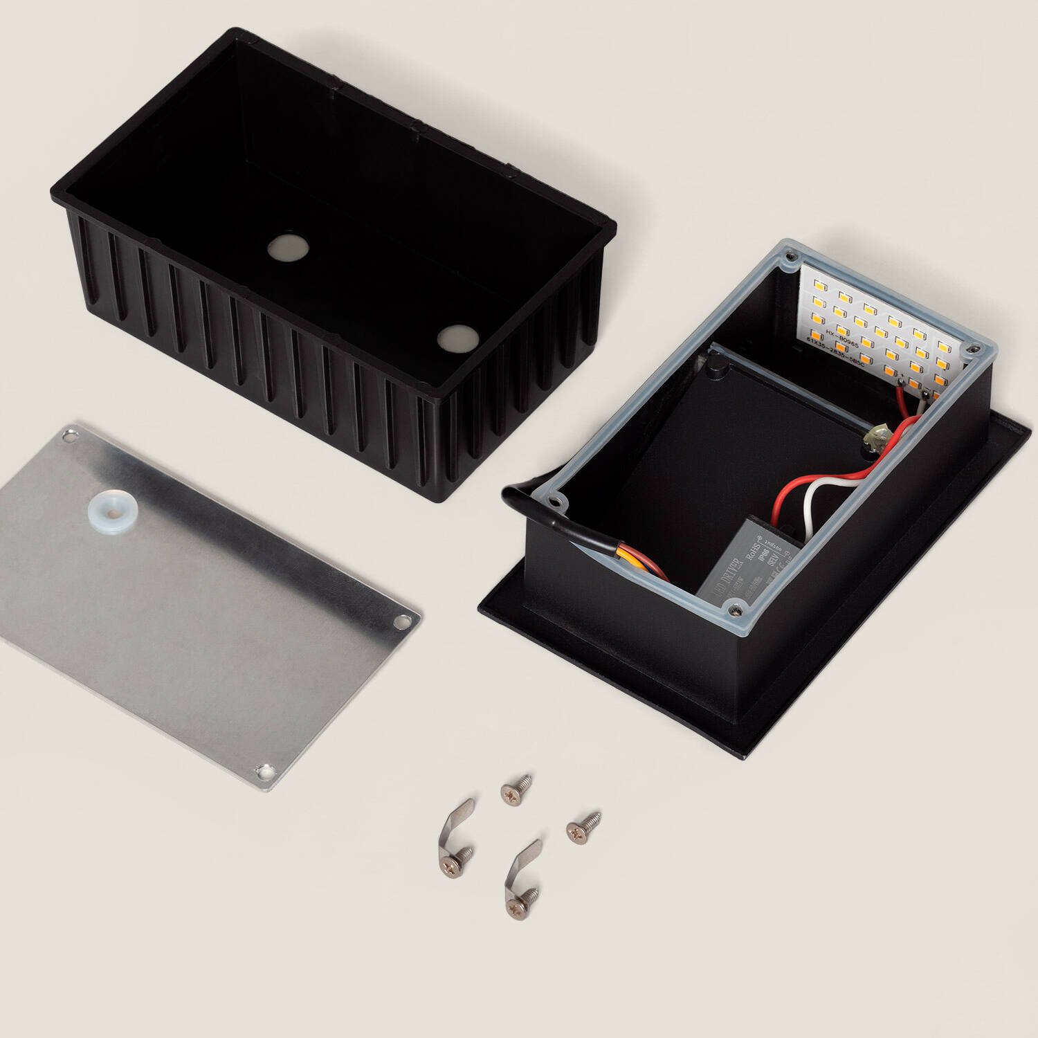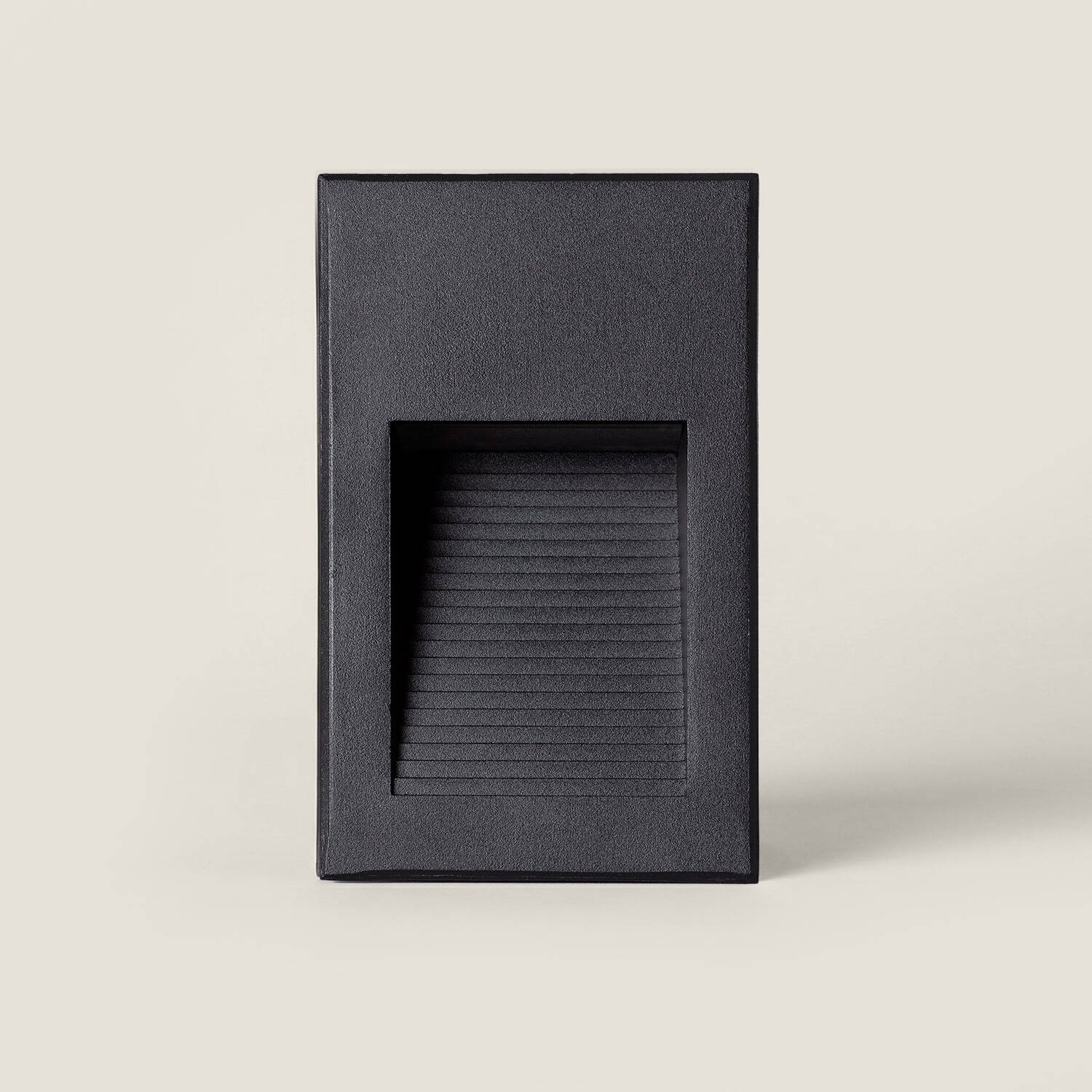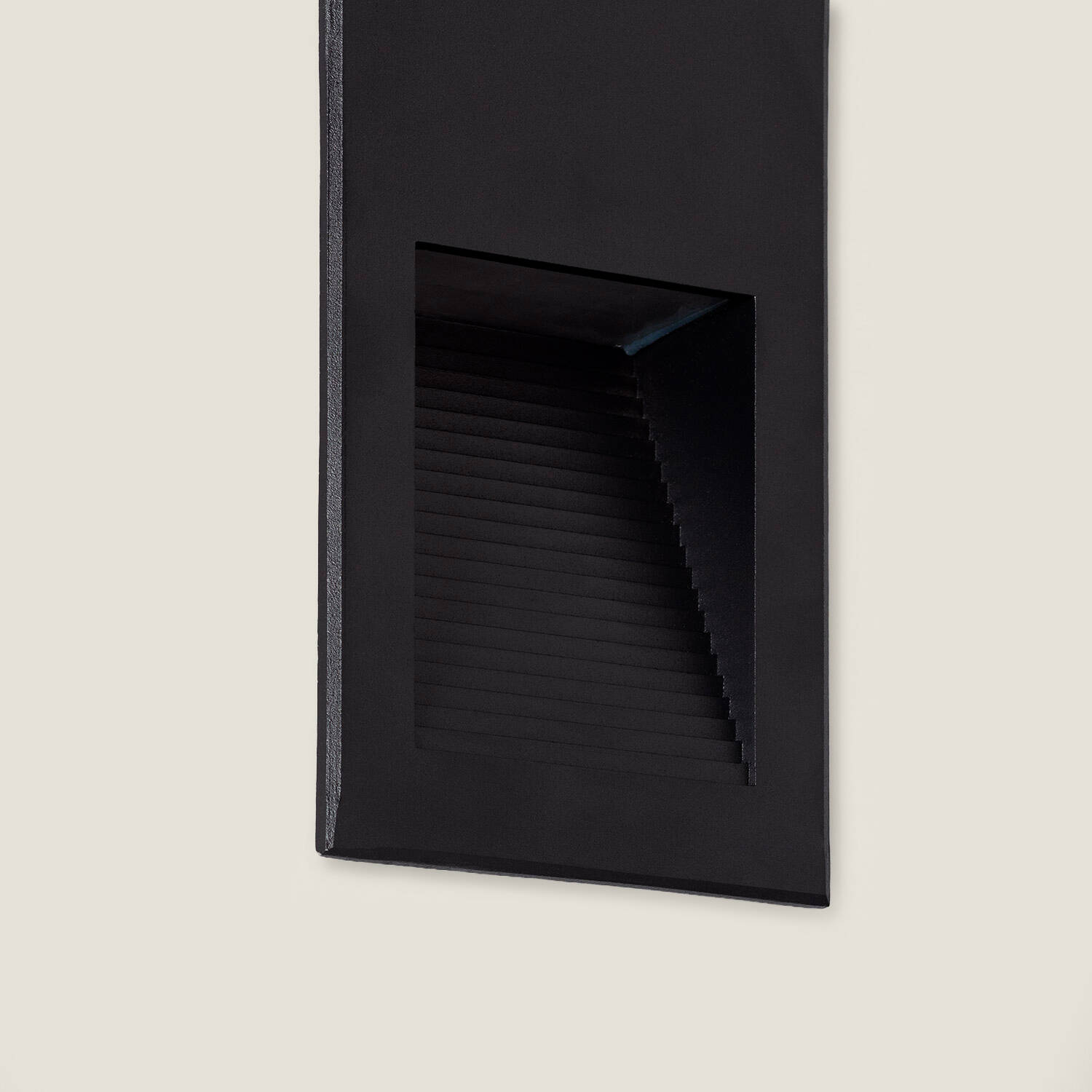 Le boîtier rectangulaire encastré, réalisé en aluminium avec diffuseur PC, propose une esthétique soignée qui se fond aux murs et plinthes. Le rendu noir met en valeur les volumes architecturaux tout en préservant une ligne visuelle épurée pour un rendu haut de gamme et durable.