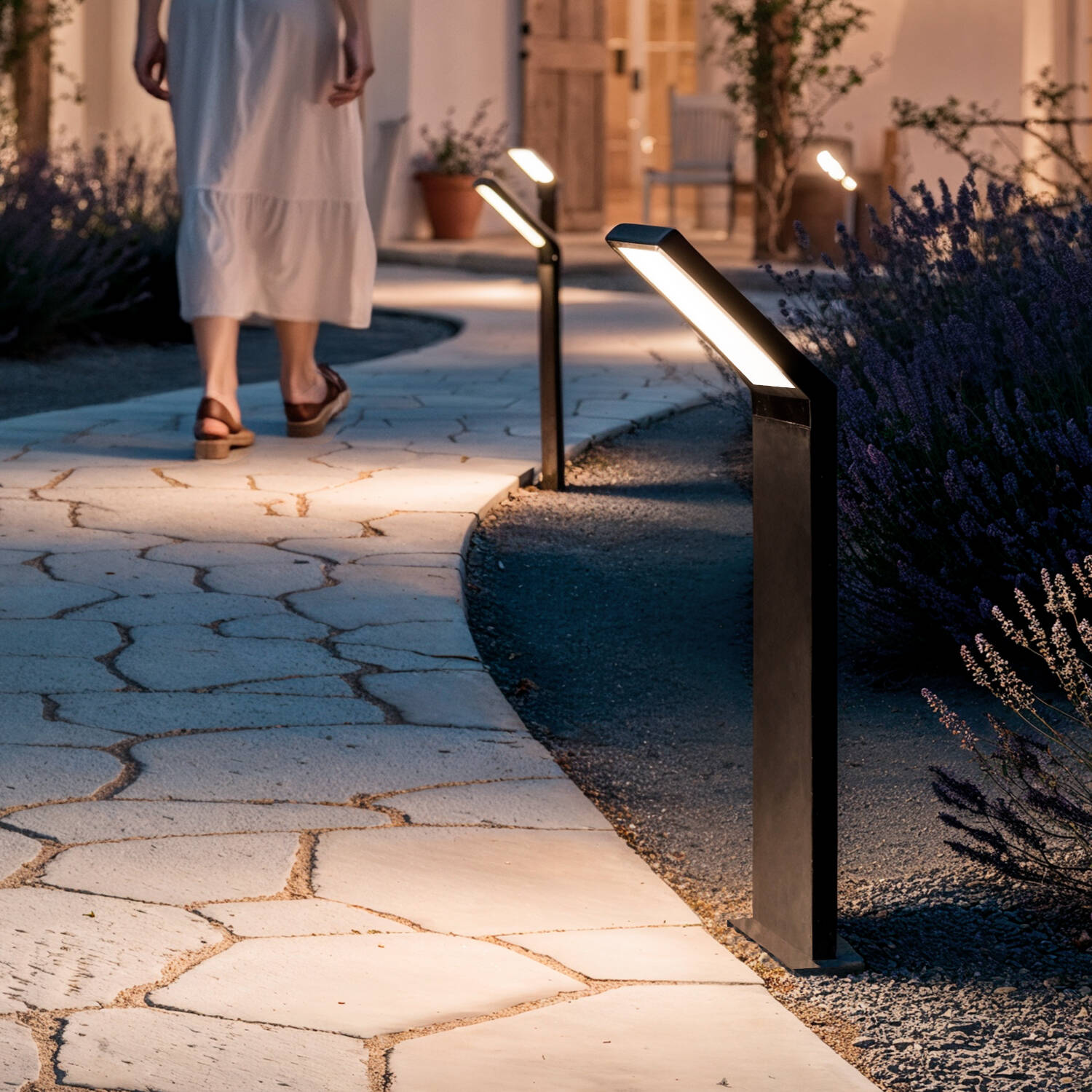 Un profil épuré en aluminium noir, une tête inclinée et un diffuseur en verre créent une silhouette contemporaine. Cette balise sur pied de 50 cm signale les zones de passage sans imposer, respectant une esthétique premium adaptée aux jardins et aux projets paysagers contemporains.