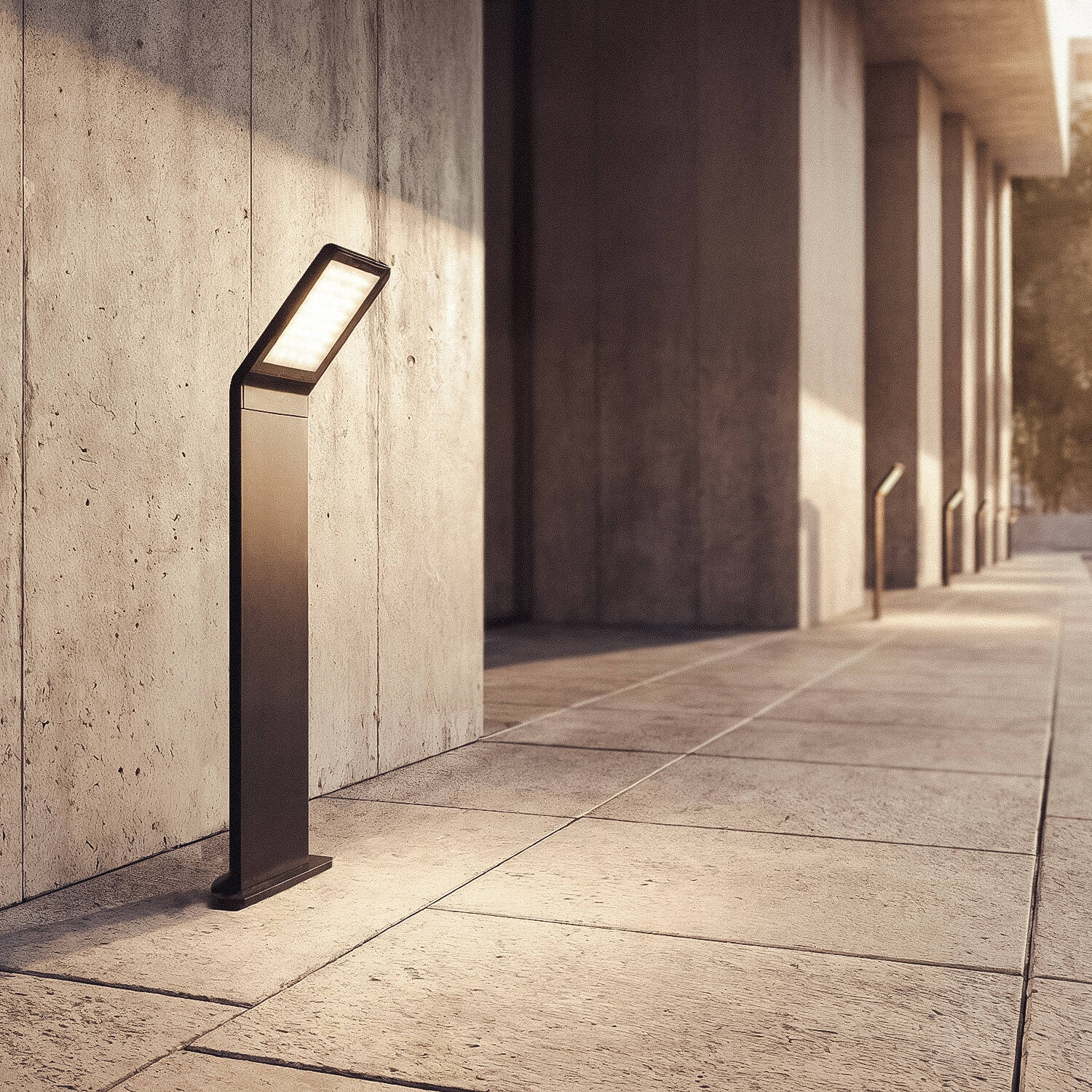 La balise Legacy diffuse une lumière blanc chaud 3000 K avec une puissance lumineuse de 630 lm, idéale pour éclairer chemins, allées et zones d'accueil en créant une ambiance chaleureuse et sécurisante. Le design incliné focalise l'éclairage vers le sol pour un guidage lumineux discret et élégant.