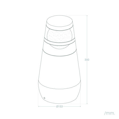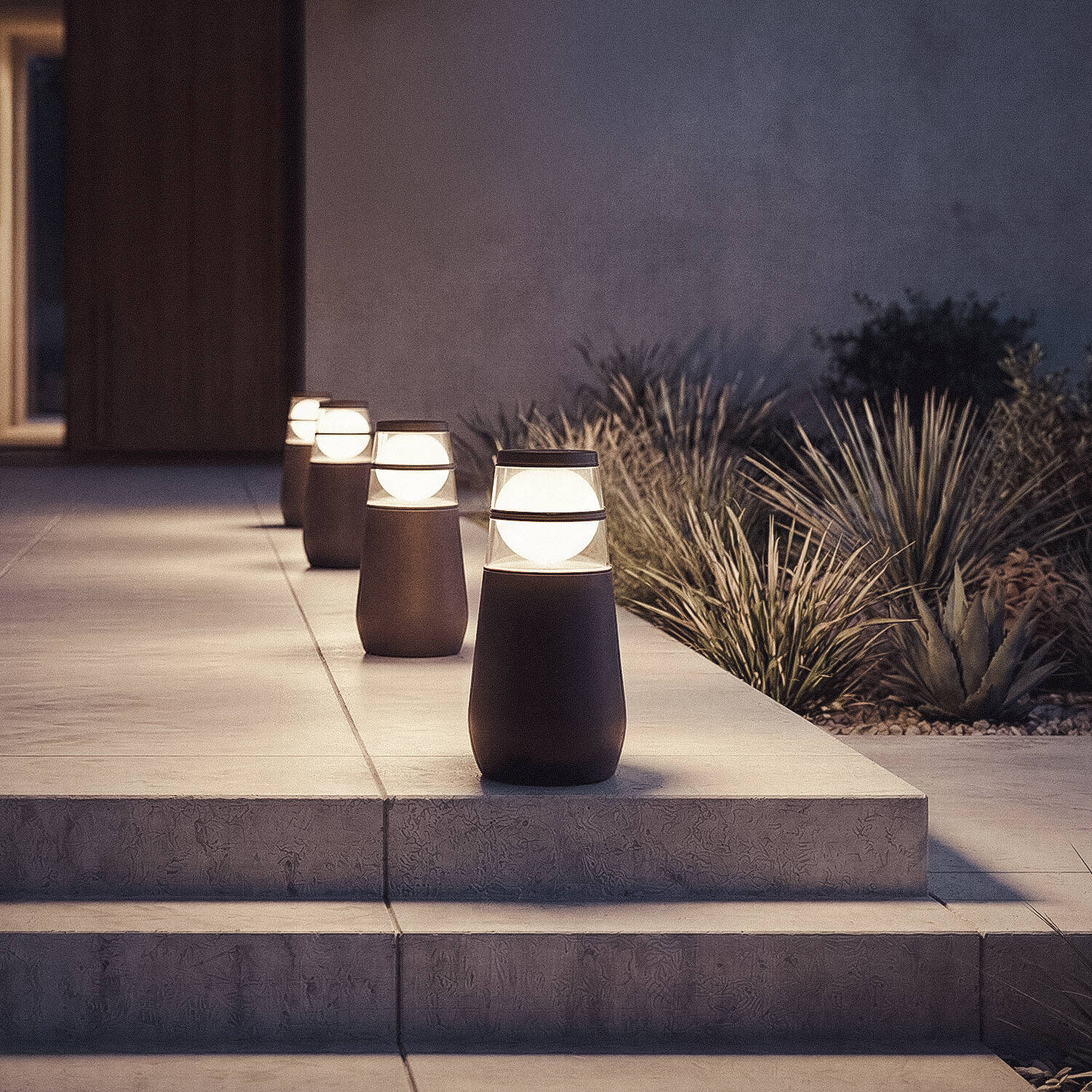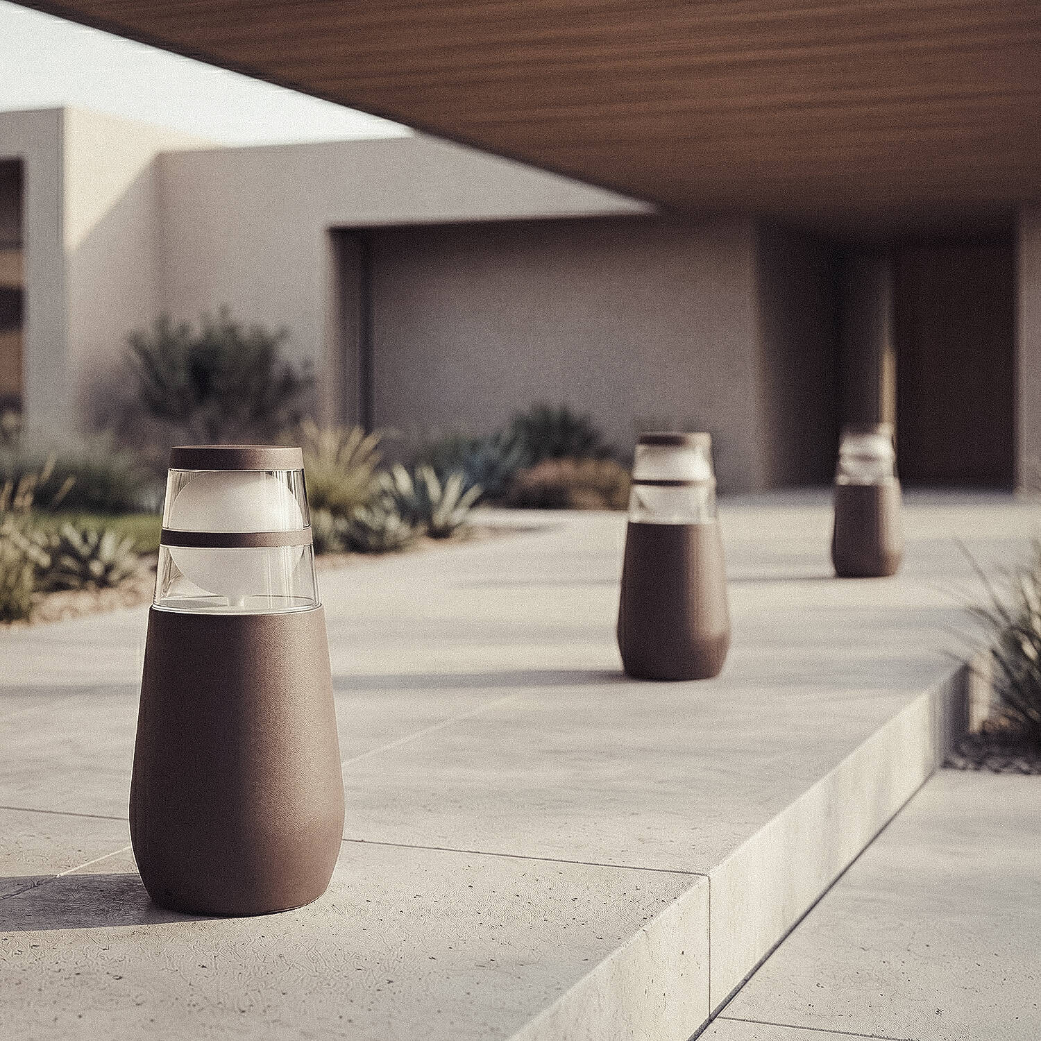 Son corps en aluminium couleur rouille affirme un style contemporain et chaleureux, parfaitement adapté aux aménagements extérieurs. Le volume compact (Ø 153 mm, hauteur 300 mm) crée un point lumineux discret mais visible, apportant caractère et harmonie sans alourdir l’espace paysager.